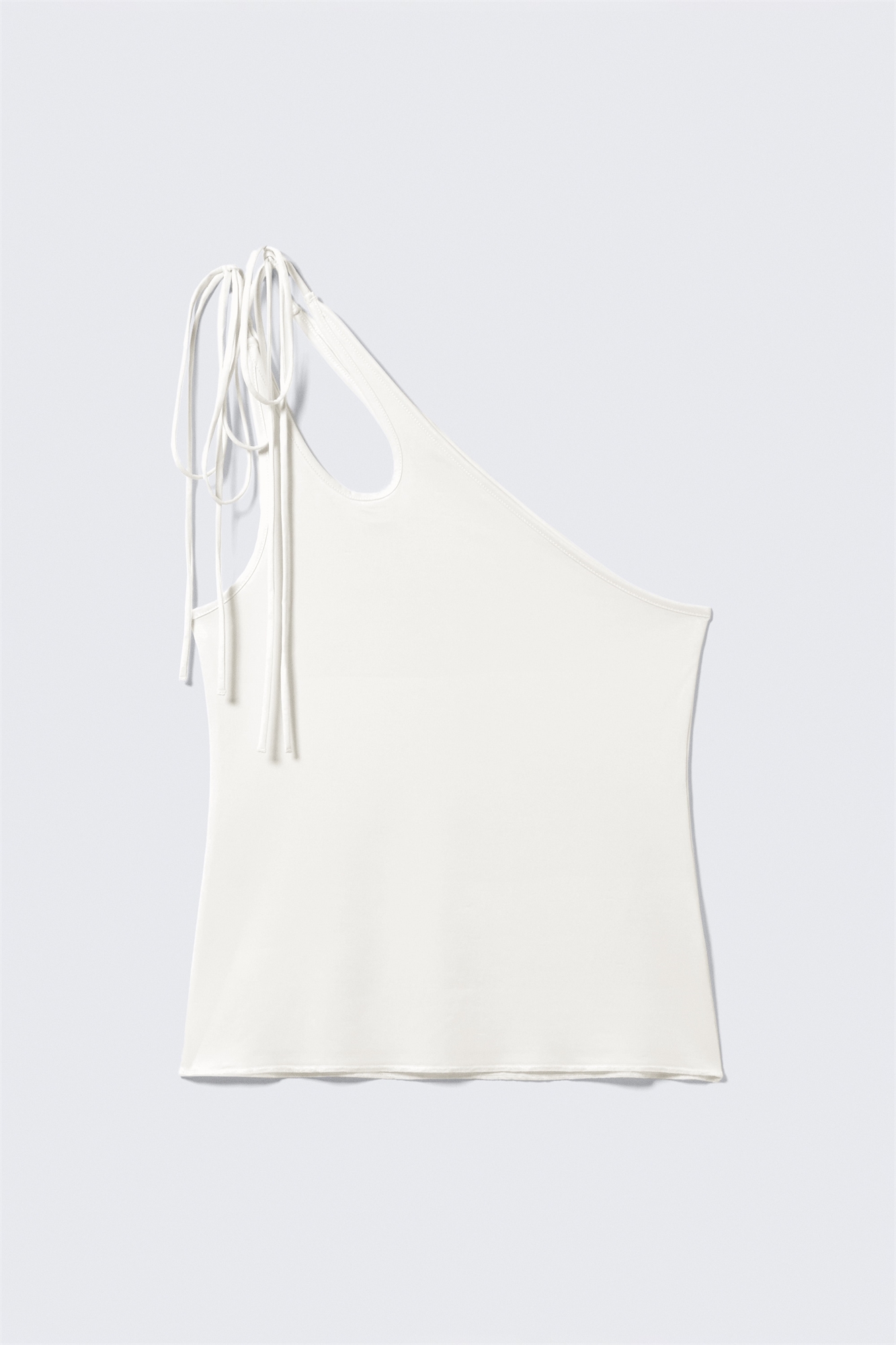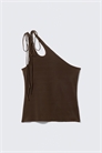 Облегающий танк-топ из мягкого трикотажа. Асимметричный вырез с двумя парами тонких завязок, застегивающихся на плече. С отделкой в виде аккуратных строчек и асимметричного подола.