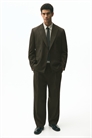 Костюмные брюки из мягкой тканой ткани с складками спереди и четкими складками вдоль ног. Застежка на потайной крючок и планку, ширинка на молнии и пуговице, диагональные боковые карманы и втачные задние карманы на пуговице. Свободный крой для пышного, но не чрезмерно большого силуэта.