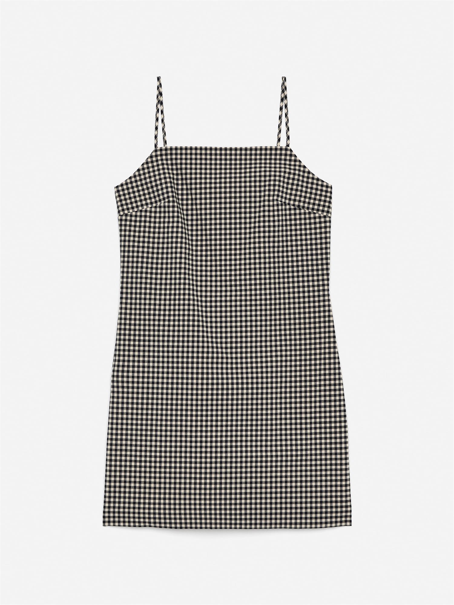 Мини-платье из гингема с тонкими бретелями и потайной застежкой-молнией по центру спины.