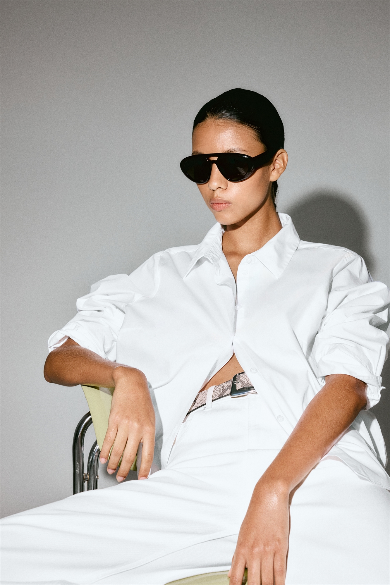 Рубашка из хрустящего хлопкового поплина с воротником, пуговицами спереди и передом сзади. Рукава длиной 3/4 с манжетами на пуговицах и рукавной планкой с пуговицей. Аккуратный закругленный подол.