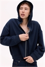 Толстовка из легкой толстовочной ткани с капюшоном на трикотажной подкладке, застежкой-молнией спереди, спущенными плечами и длинными рукавами. Манжеты и подол отделаны резинкой.