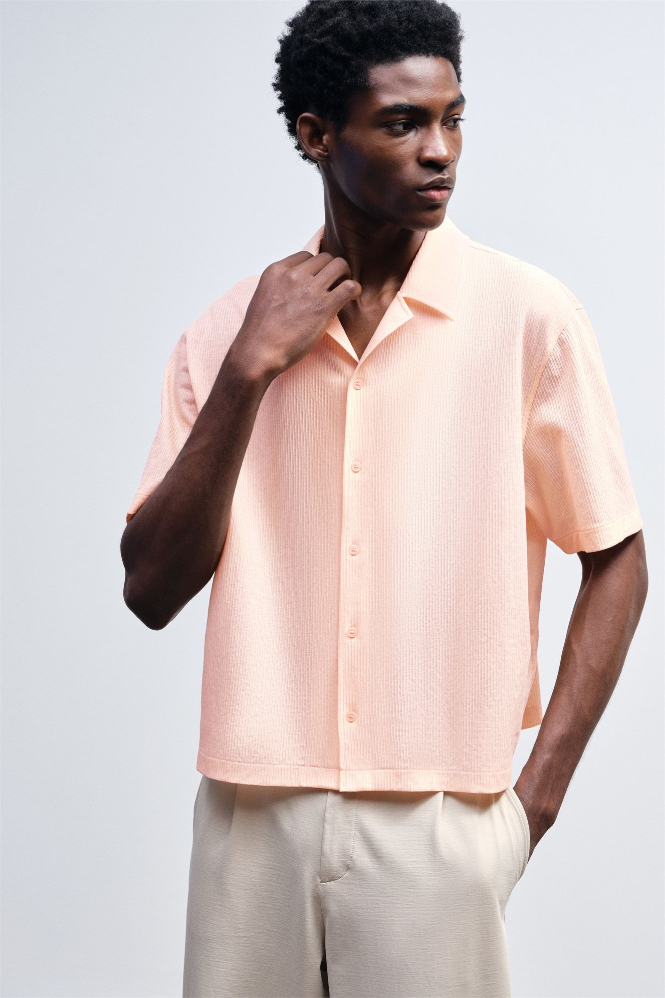 Обрезанная рубашка из ребристого джерси с курортным воротником, французским передом, короткими рукавами и прямым покроем. Свободный крой для пышного, но не слишком большого силуэта.