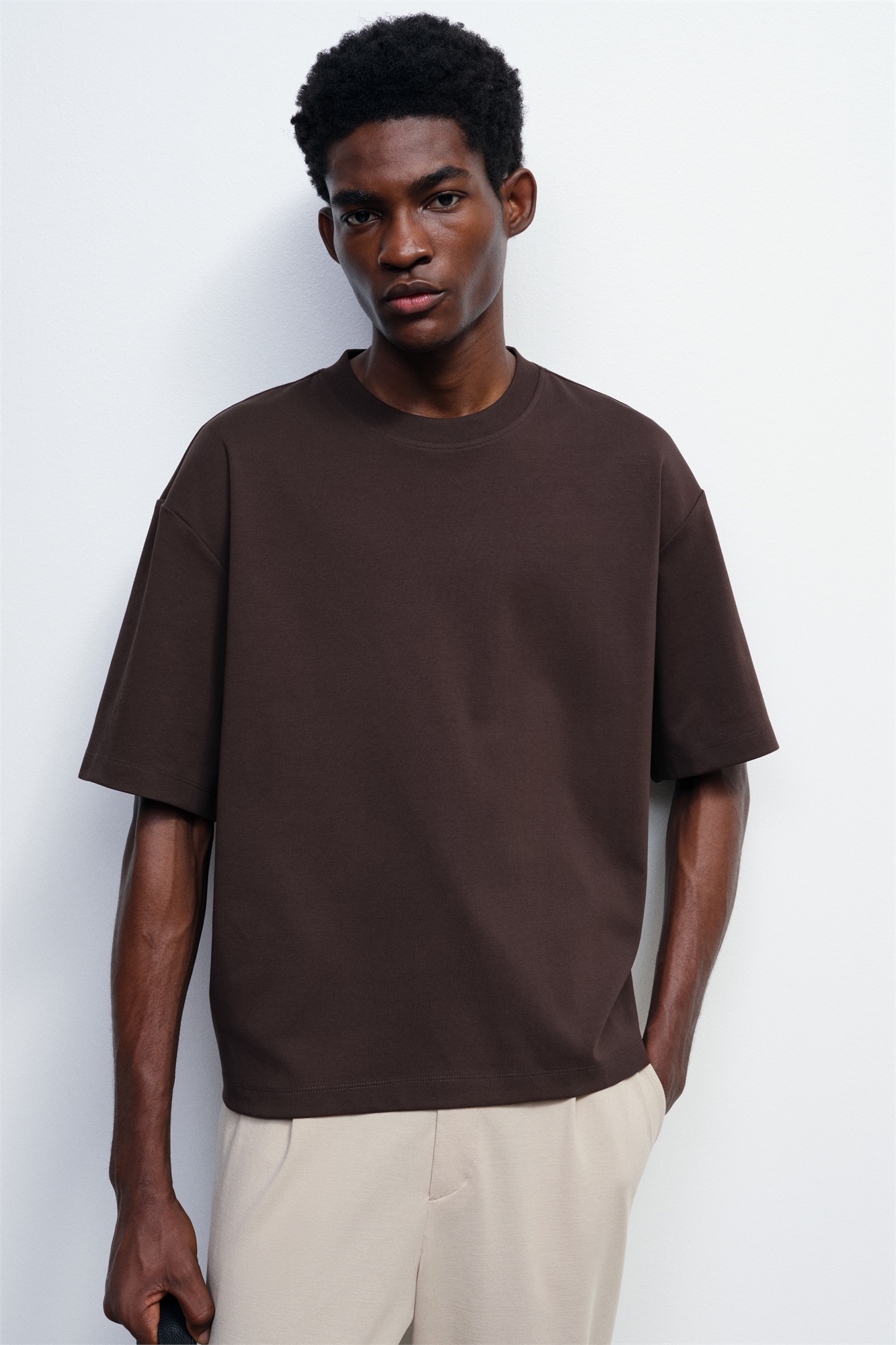 Футболка в стиле бокс из плотного хлопкового джерси с круглым вырезом в рубчик, спущенными плечами и прямым покроем. Свободный крой для пышного, но не слишком большого силуэта.
