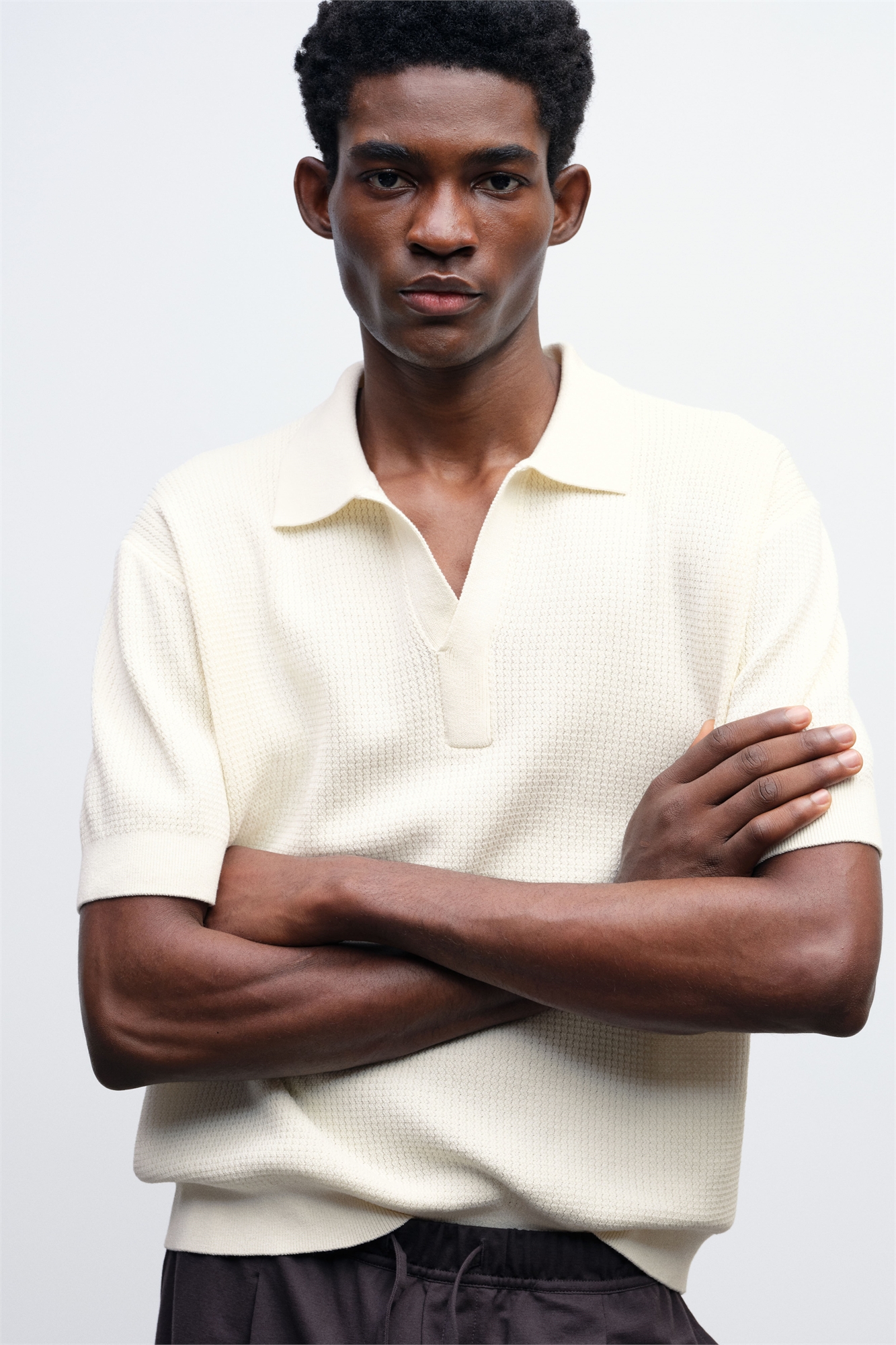Рубашка-поло из тонкого кабельного трикотажа с воротником, небольшой V-образной проймой в верхней части и короткими рукавами. Манжеты и подол отделаны мелкой тесьмой. Регулярный крой для удобной посадки и классического силуэта.