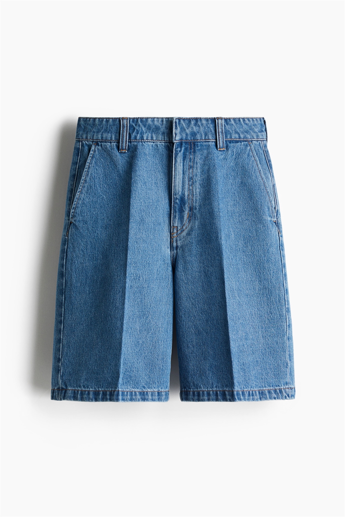 Шорты длиной до колена из хлопкового денима с высокой талией и ширинкой на молнии с потайной застежкой на пуговицу и крючок с планкой. Диагональные боковые карманы, фальшивые карманы сзади и складки спереди и сзади.