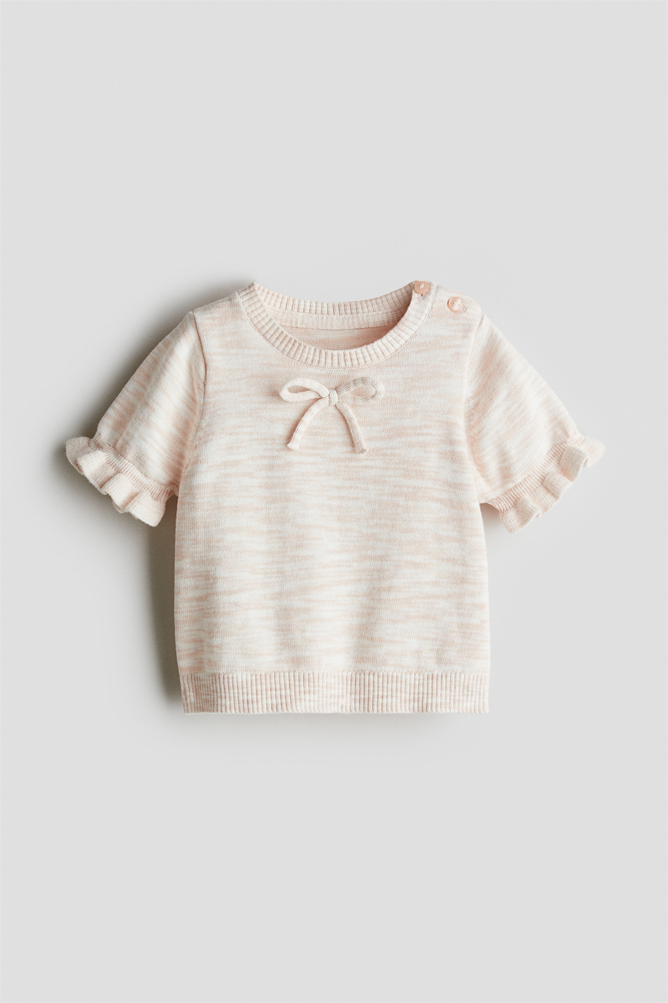 Топ из мягкого хлопка тонкой вязки с декоративным бантом спереди. Круглый вырез с ребристой отделкой и пуговицами на одном плече, короткие рукава с оборванными манжетами и тесемками по подолу.