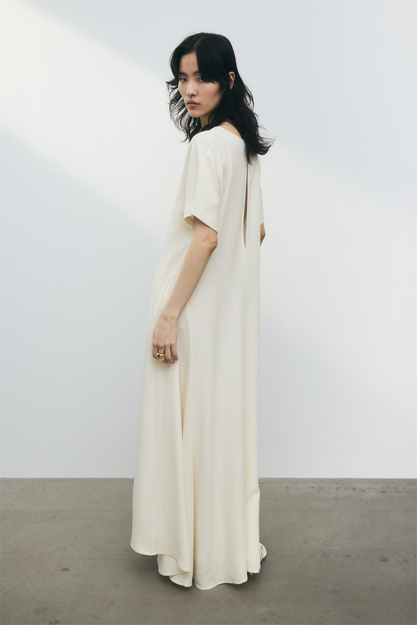 Длинное платье из тканого материала, изготовленного из смеси вискозы. Свободный крой, круглый вырез, глубокий разрез с потайной пуговицей сзади, рукава-бабочки и незаметные боковые карманы. Без подкладки.