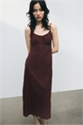 Платье длиной до колена из воздушного льна и вискозы. Круглый вырез со сборками, узкие регулируемые бретели и сборчатый шов под бюстом. Скрытая застежка-молния с одной стороны и прямой подол с разрезом сзади. Подкладка из хлопкового вуаля.