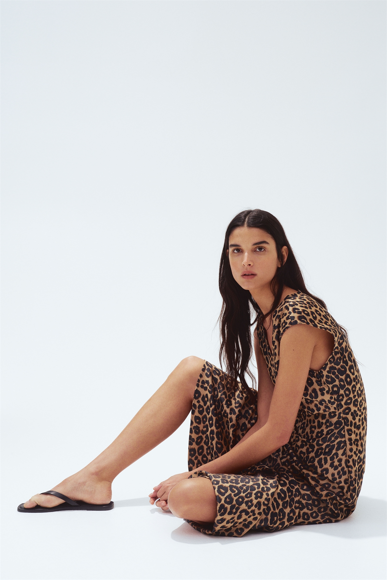 Приталенное платье длиной до колен из мягко драпирующегося атласа. Силуэт без рукавов, глубокий V-образный вырез, диагональный шов ниже бедер и расклешенная юбка. Потайная застежка-молния с одной стороны. Без подкладки.