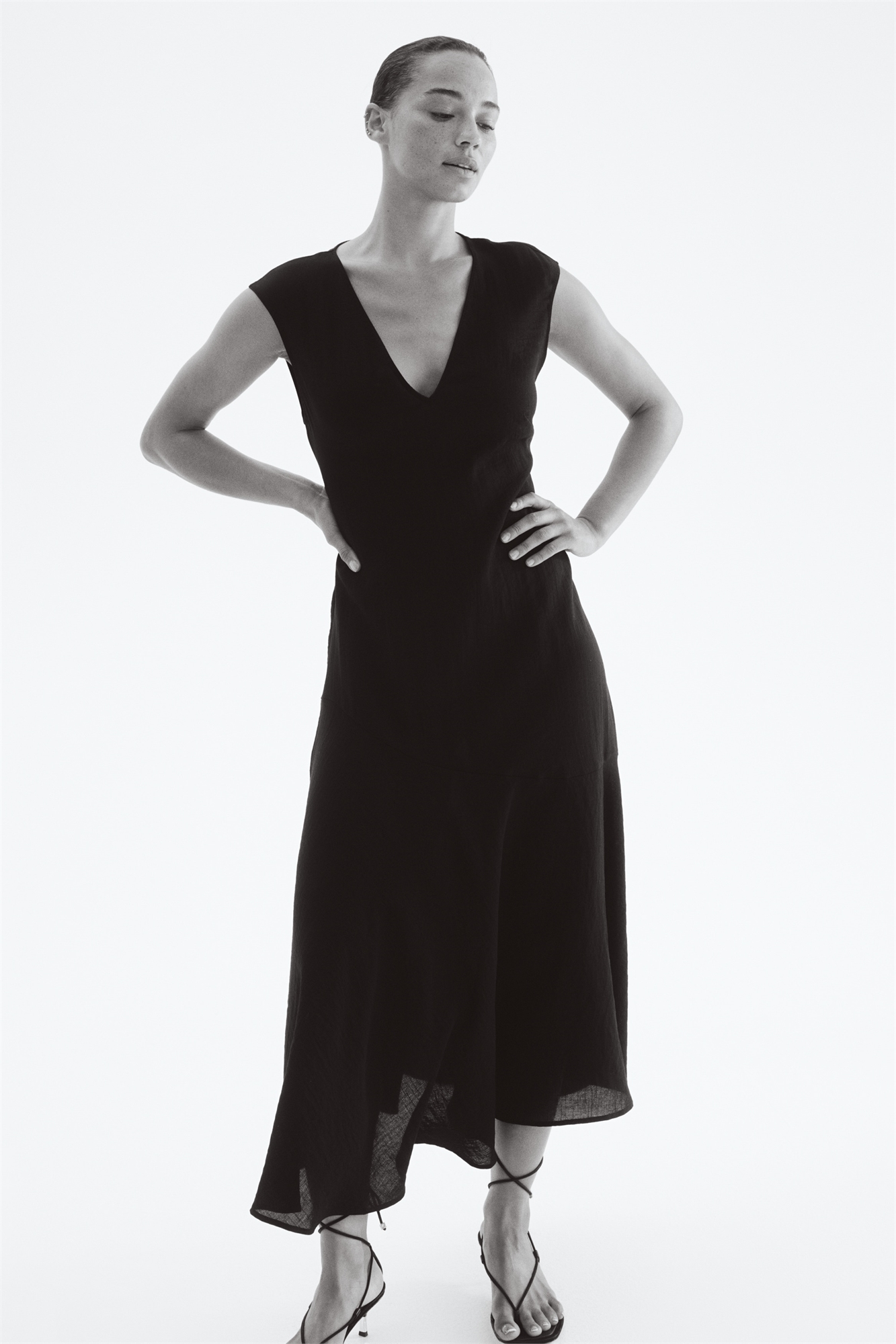 Приталенное платье длиной до колен из мягко драпирующегося атласа. Силуэт без рукавов, глубокий V-образный вырез, диагональный шов ниже бедер и расклешенная юбка. Потайная застежка-молния с одной стороны. Без подкладки.