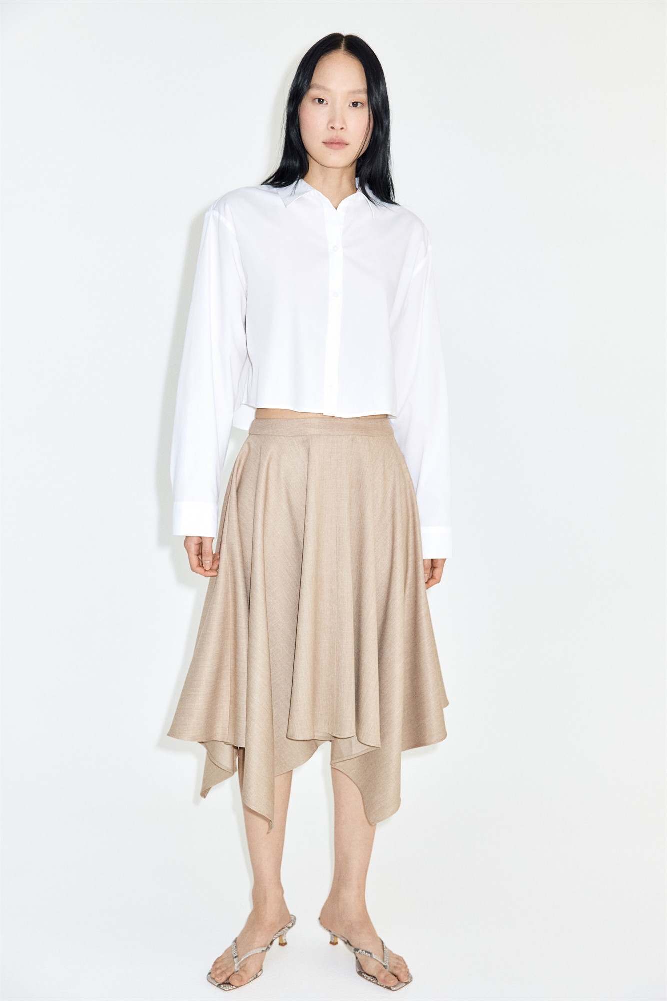 Юбка длиной до колена из драпированного полотна с заниженной талией и потайной застежкой-молнией. Свободный крой и асимметричный подол делают ее интересным и стильным выбором. Без подкладки.
