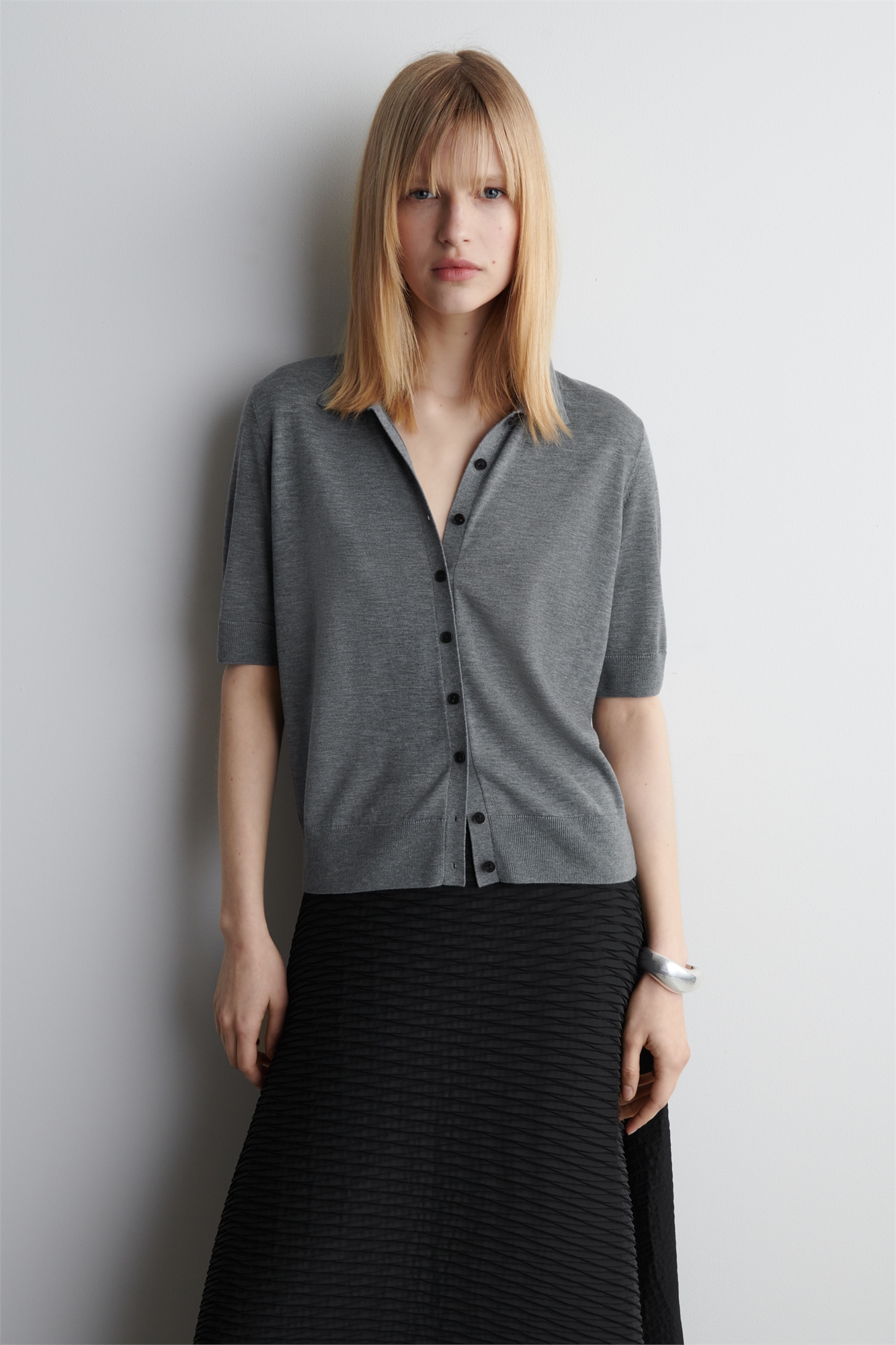 Этот утонченный кардиган-поло выполнен в уменьшенном варианте по мотивам силуэтов 90-х годов. Он связан из легкого материала TENCEL™ Lyocell и мериносовой шерсти и имеет короткие рукава, детали из пуантель и ребристый подол. Regular fitButton closureTENCEL™ is a trademark of Lenzing AG. TENCEL™ Lyocell производится из возобновляемых источников древесины с использованием процесса, в котором перерабатывается 99% всех химических веществ и воды Материал: 67% TENCEL™ Lyocell, 33% мериносовой шерсти. Без учета отделки / Машинная стирка Длина по спинке для размера S составляет 57 см / Модель носит размер S