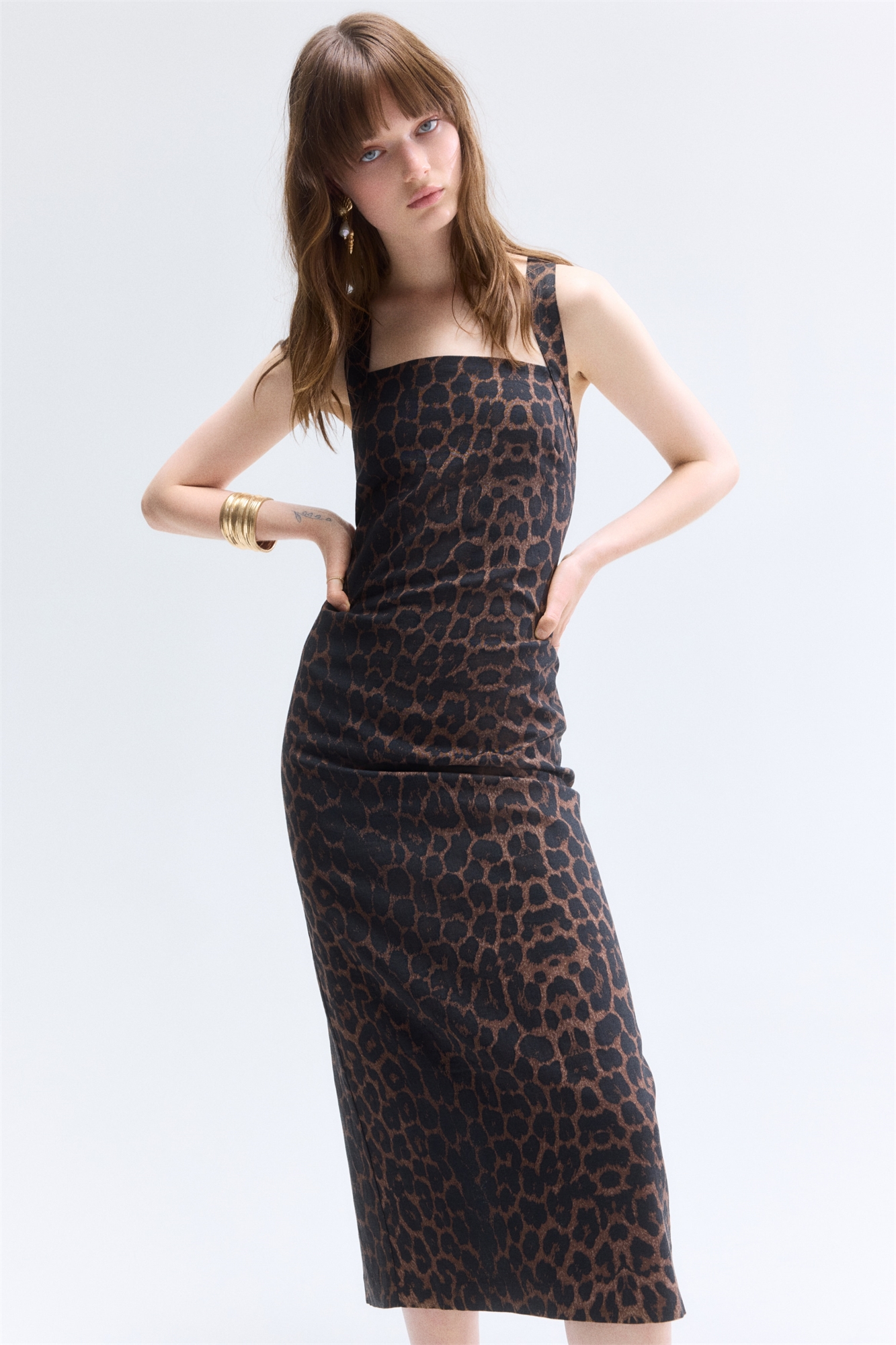 Приталенное платье длиной до колен из льна и вискозы с квадратным вырезом и широкими бретелями, перекручивающимися сзади. Вытачки на груди, потайная застежка-молния и застежка-крючок сзади, прямой подол с разрезом сзади. Подкладка из хлопкового вуаля.