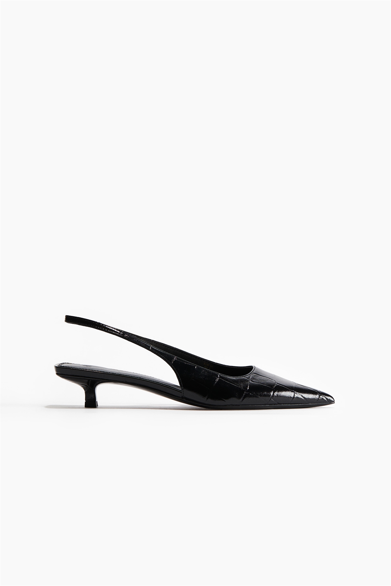 Туфли на каблуке из лакированной ткани с заостренным носком, узким эластичным ремешком на каблуке и каблуком-рюмочкой. Атласная подкладка.