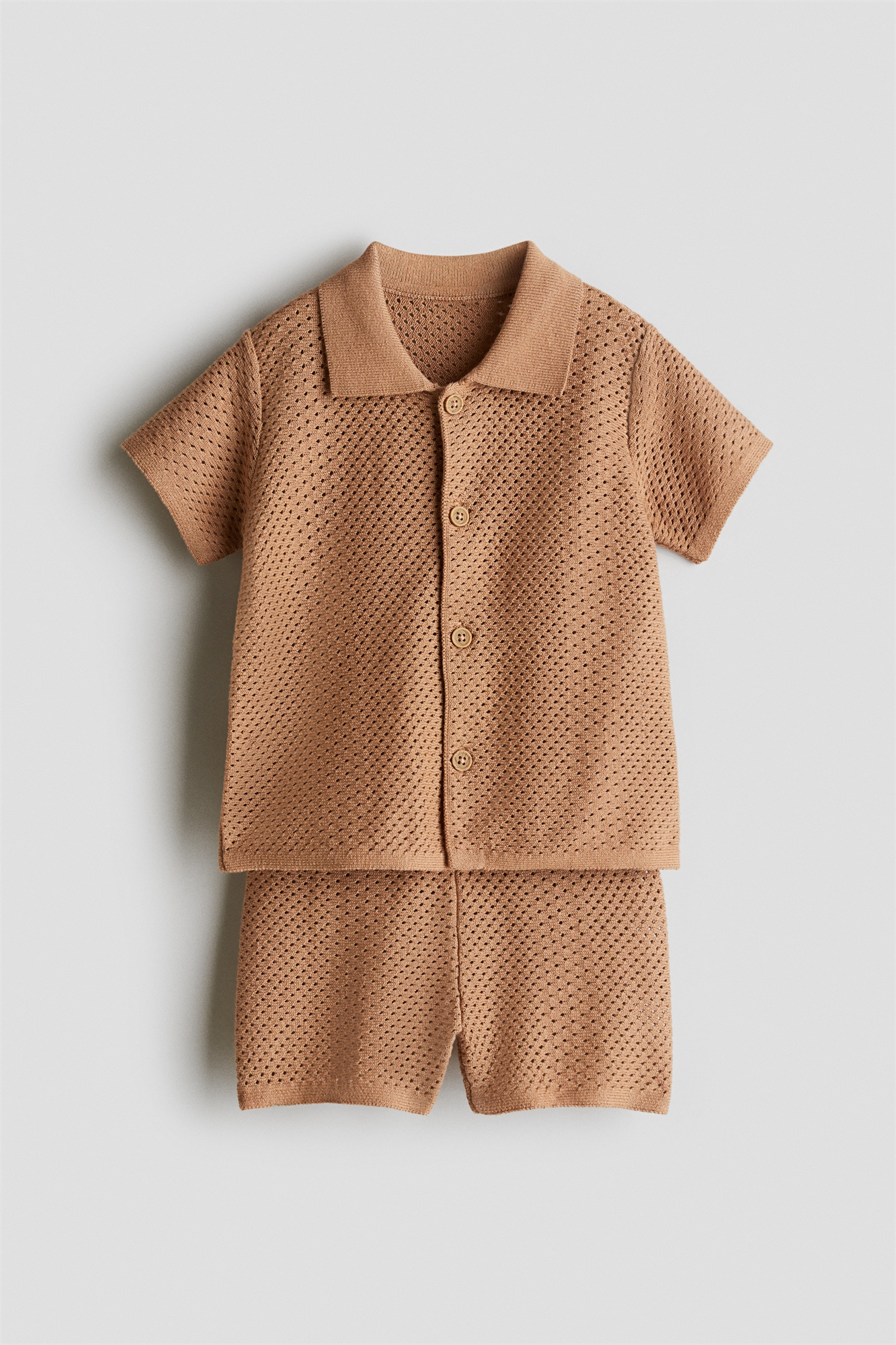 Комплект из рубашки и шорт из мягкого хлопка с сетчатой вязкой. Рубашка с короткими рукавами, ребристым воротником и пуговицами спереди. Манжеты и подол отделаны тонкой вязкой. Шорты с эластичной, утягивающейся талией и отделкой из тонкой вязки по подолу.