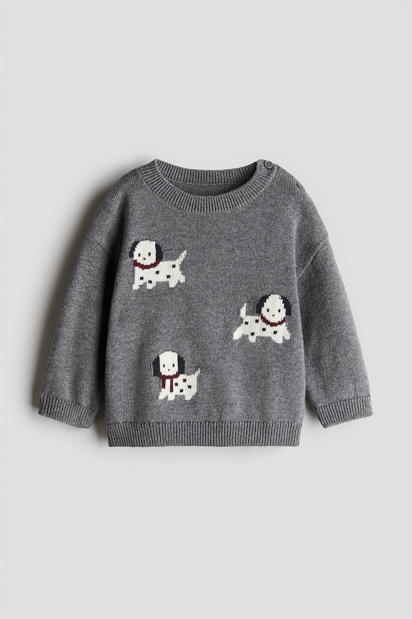 Джемпер из мягкого хлопка жаккардовой вязки. Круглый вырез в рубчик с пуговицами с одной стороны, спущенные плечи, манжеты и подол в рубчик.