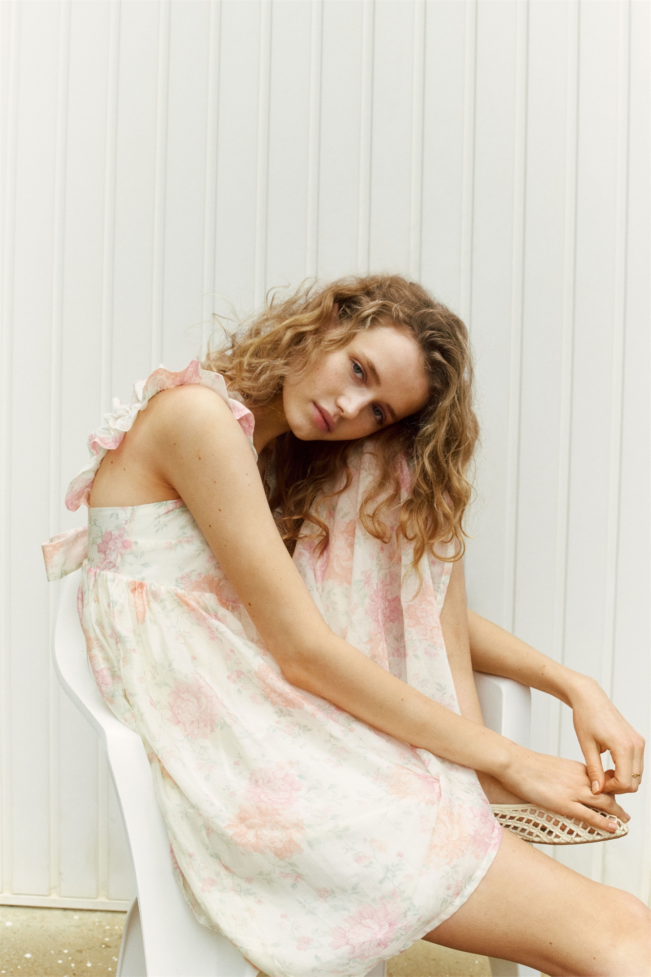 Короткое платье из воздушной ткани с квадратным вырезом и широкими двухслойными бретелями с эластичным швом, создающим эффект рюши. Приталенный лиф с широкими завязками сзади и открытым разрезом на талии с эластичным швом внизу. Собранный шов под бюстом и расклешенная юбка. На подкладке.