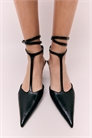 Сандалии на каблуке из лакированной ткани с Т-образным ремешком и регулируемым ремешком, обхватывающим лодыжку. Заостренный носок и закрытый каблук. Атласная подкладка.