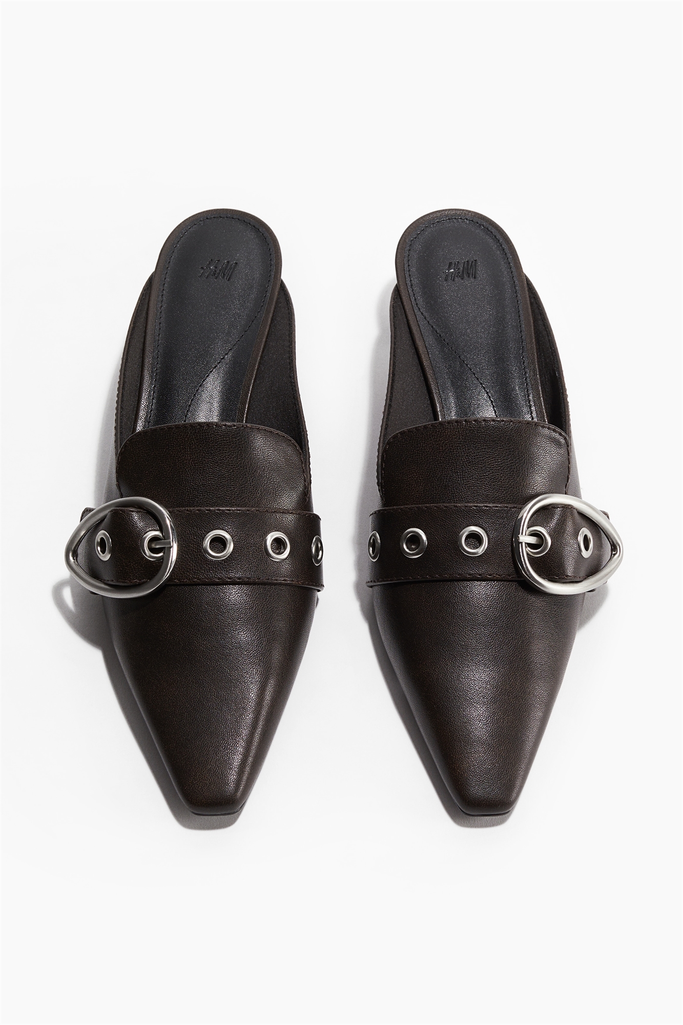 Мюли на каблуке из лакированной ткани с заостренными мысками, язычком и металлической пряжкой спереди. Атласная подкладка.