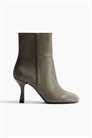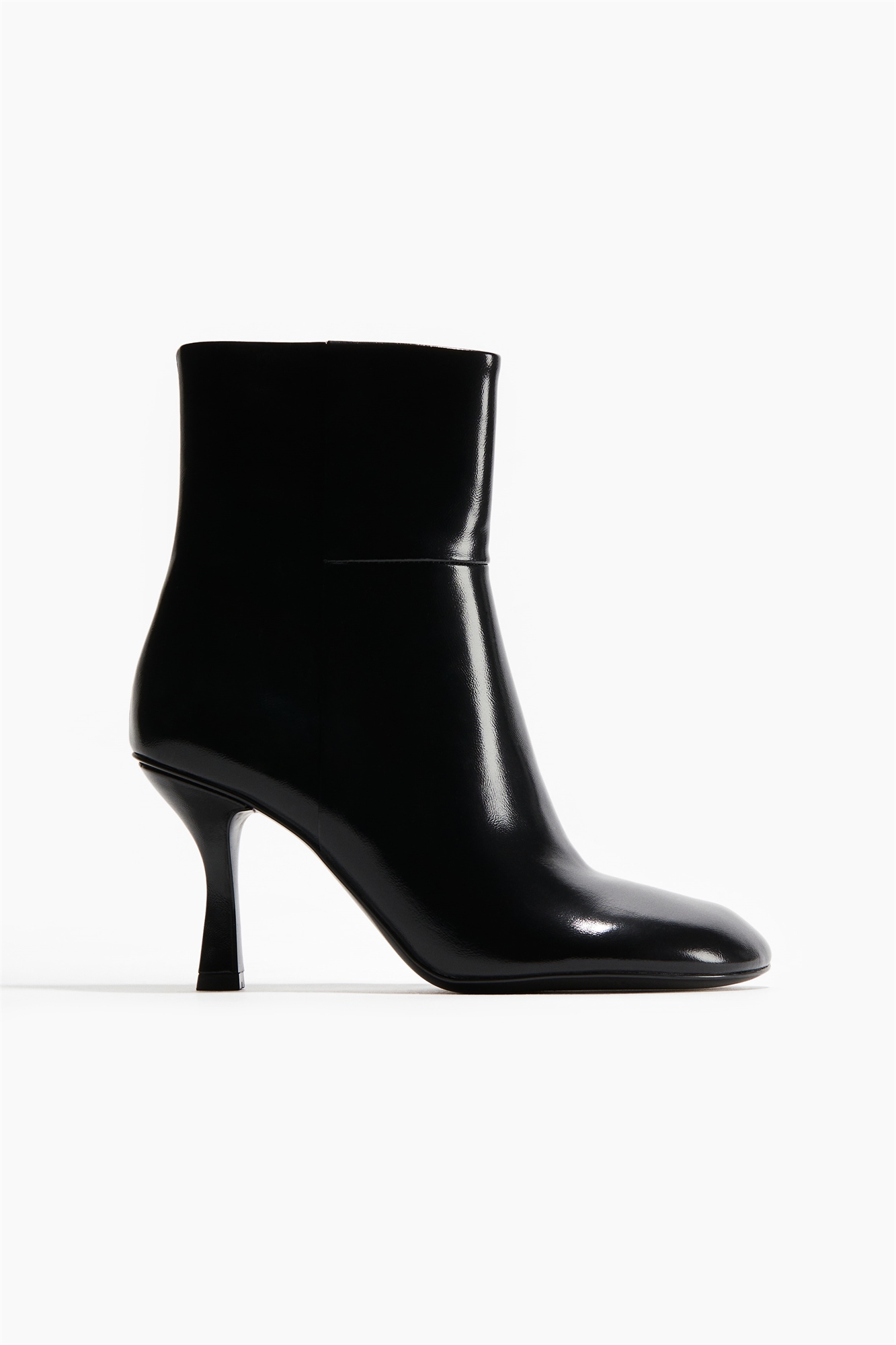 Ботинки по щиколотку из лакированной ткани с угловатыми носками, каблуком-шпилькой и потайной застежкой на молнию с одной стороны. Атласные подкладка и стелька.
