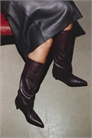 Сапоги из мягкой кожи с заостренным носком, закрытым узким каблуком и голенищем до колена. Подкладка из джерси.