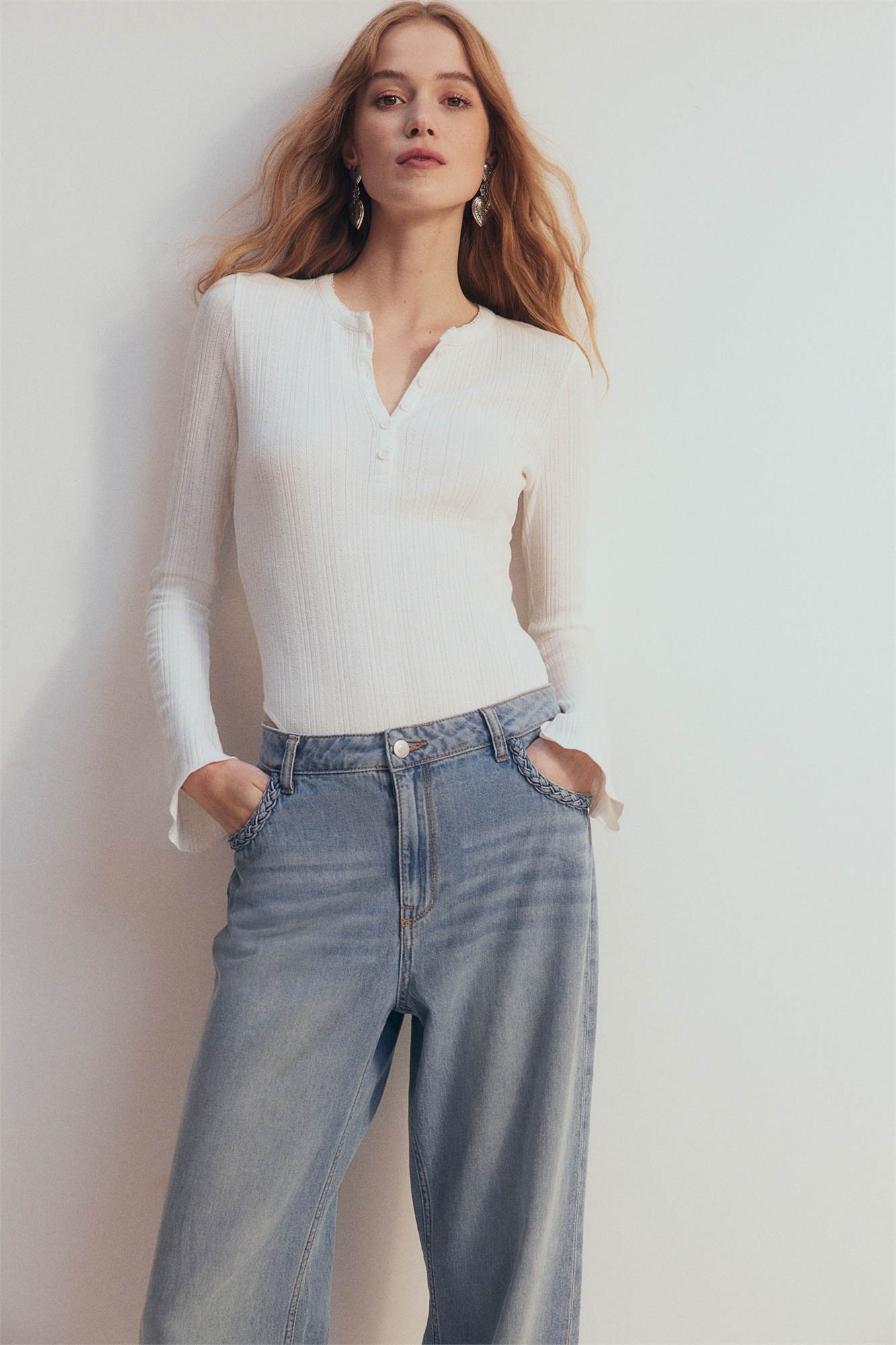 Боди из мягкого трикотажа пуантель с круглым вырезом, застежкой на пуговицы и длинными рукавами-трубами с манжетами из оверлока. Скрытые кнопки в промежности.