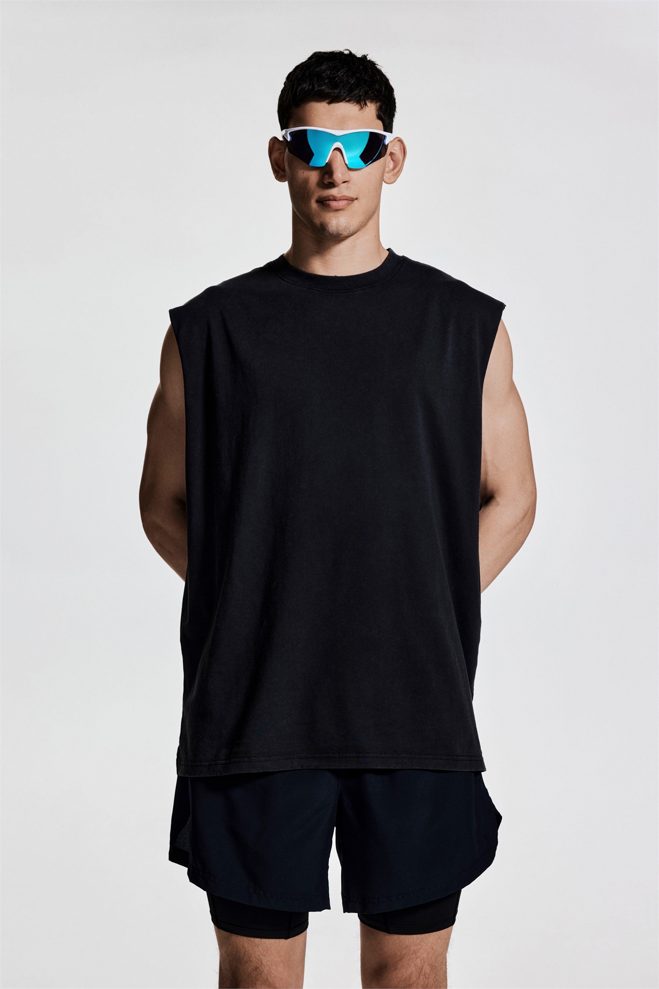 Спортивный жилет из трикотажа с эффектом стирки и мягкой текстурой. Свободный крой с круглым вырезом в рубчик, необработанными краями по проймам и прямым подолом с небольшим разрезом с каждой стороны.