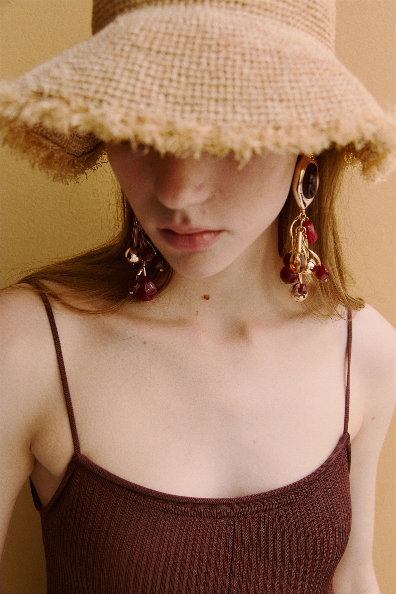 Длинные серьги с асимметричной верхней частью с деталью в виде камня и гроздью бусин разного дизайна внизу.