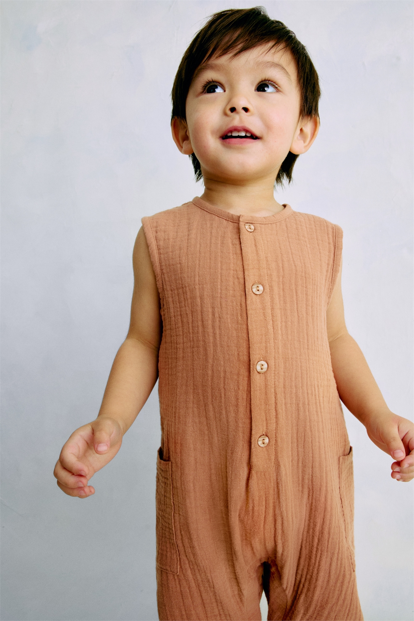 H&M Adorables. Ромпер без рукавов из мягкого, воздушного муслина, изготовленного из высококачественного хлопка. Круглый вырез, пуговицы спереди и открытые накладные карманы по бокам. Потайные кнопки на ножках для удобства переодевания и вшитые оборочки по краям. Коллекция H&M Adorables - это подборка удобных и качественных вещей, не теряющих актуальности.
