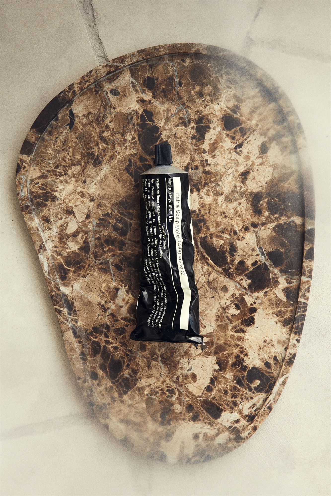 Асимметричный поднос из мрамора. Поскольку мрамор является натуральным материалом, цвет и фактура каждого изделия могут отличаться.
