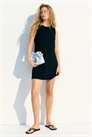 Короткое платье без рукавов из плотного джерси с круглым вырезом и гребешковой отделкой по вырезу и проймам.