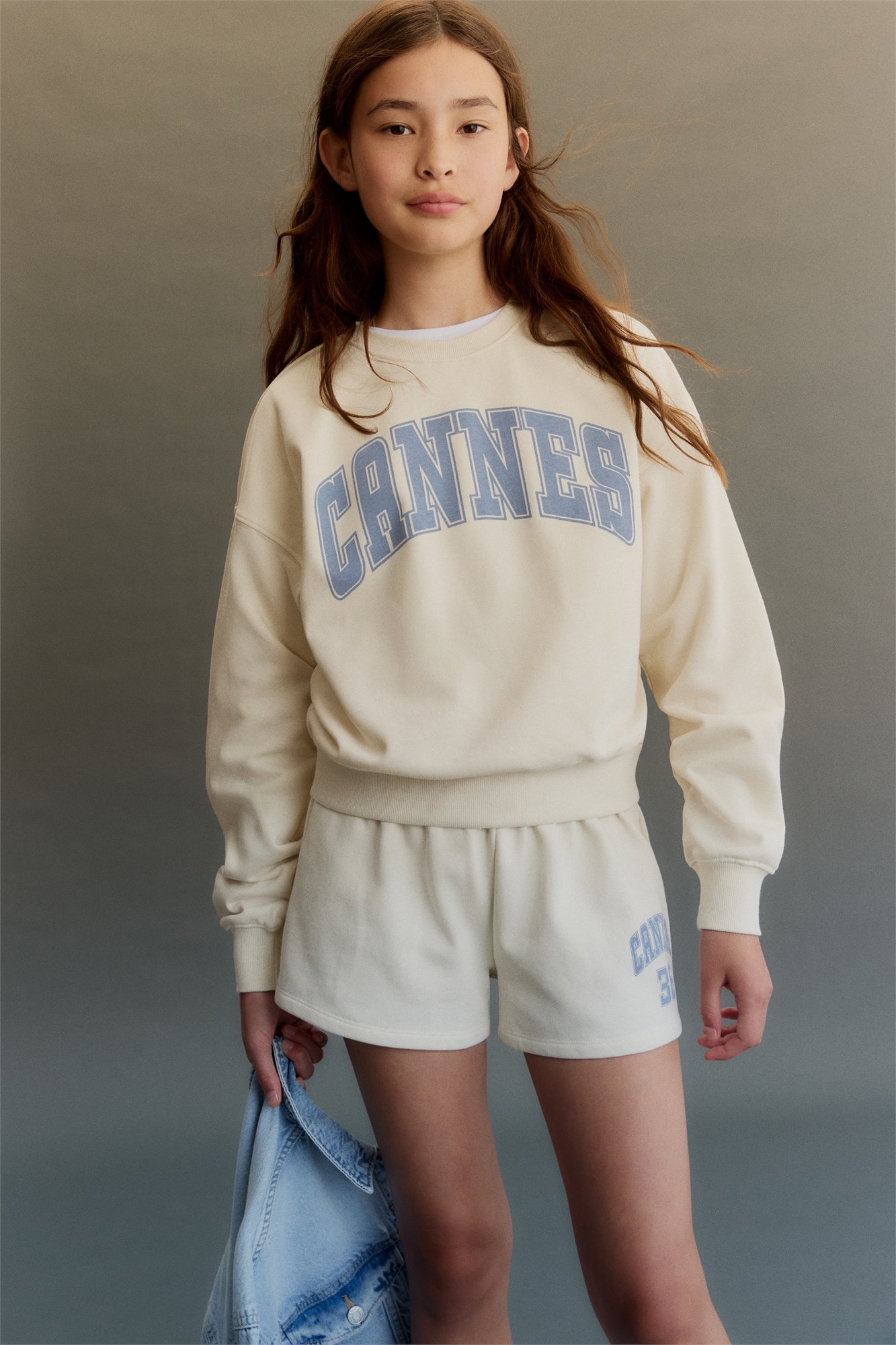Комплект из топа и шорт из легкой толстовки с принтом. Топ с длинными рукавами, круглым вырезом с ребристой отделкой, спущенными плечами и окантовкой манжет и подола. Шорты с эластичным утягивающим поясом.