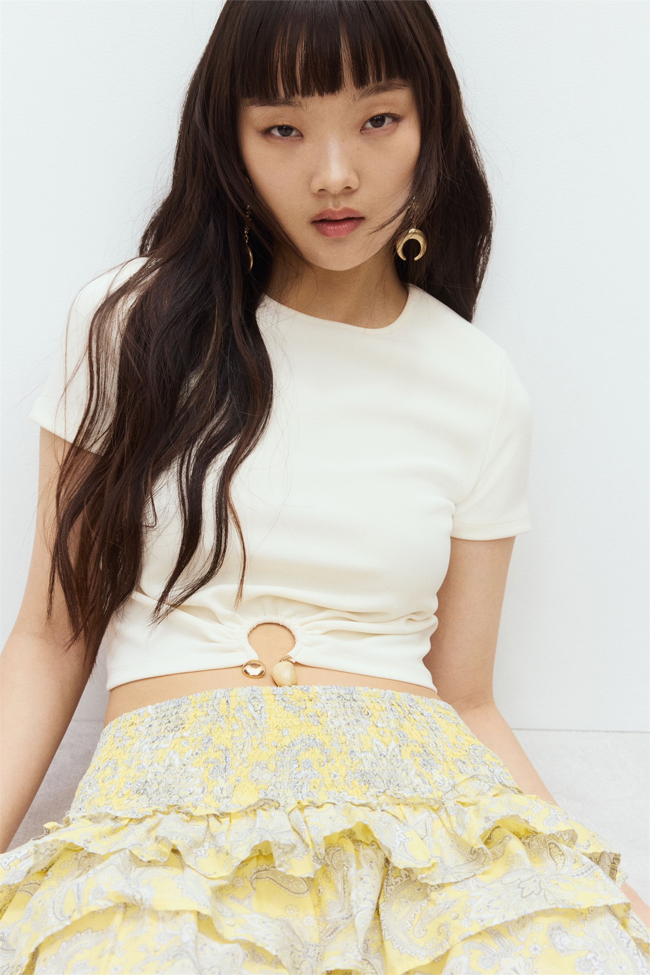 Приталенная футболка из узкого ребристого трикотажа с вырезом и металлической проволокой с бисером на подоле спереди.