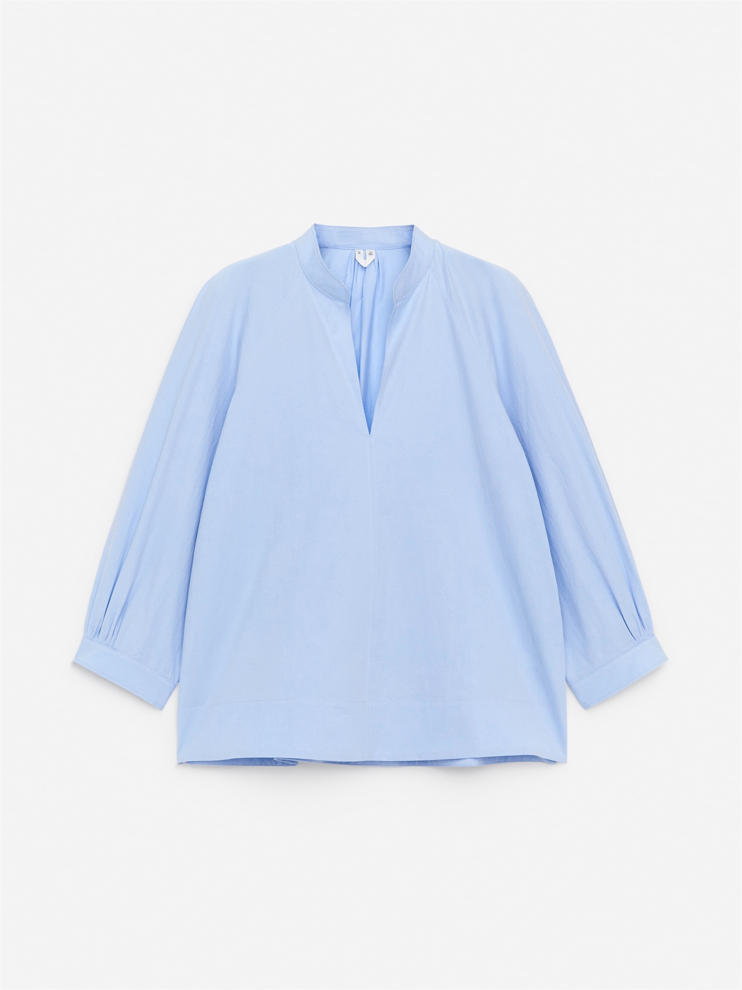 Хлопковая блузка с V-образным вырезом, воротником-стойкой и рукавами длиной три четверти. Сборчатые детали и застежка на пуговицы на манжетах. Обычный крой.