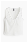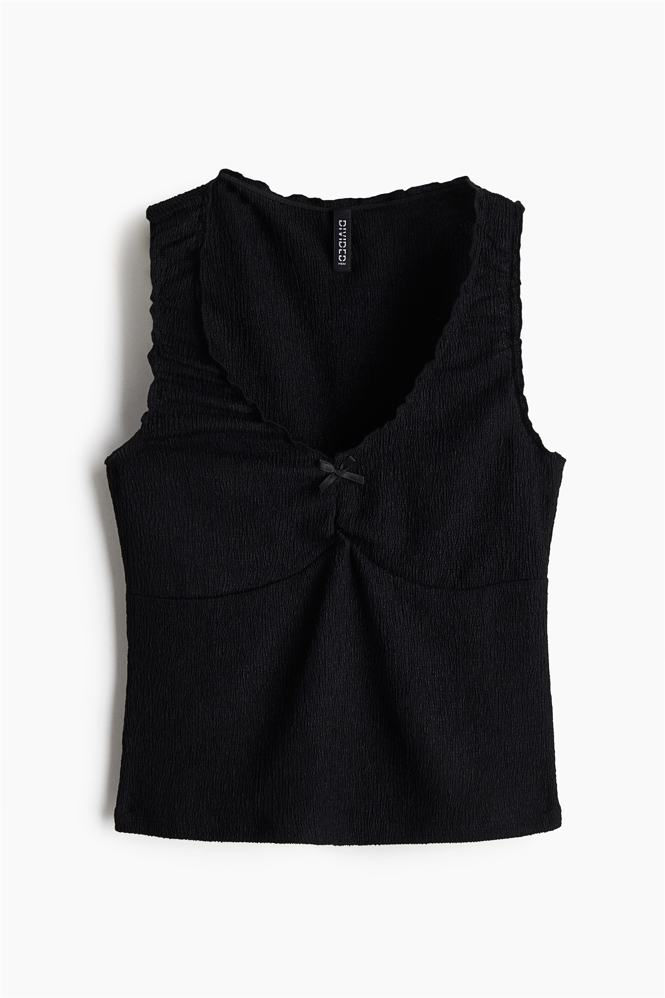 Короткий приталенный жилет из мягкого махрового трикотажа с оборками и V-образным вырезом. Присборенный шов и декоративный атласный бант по центру бюста.