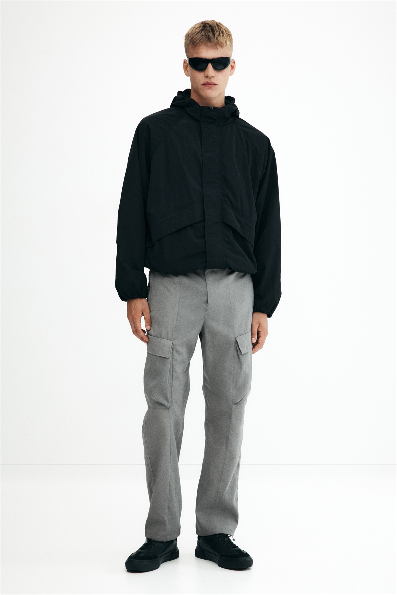 Брюки-карго из нейлона с эластичной отделкой, утягивающим шнурком на талии и ширинкой на молнии с прижимной планкой. Боковые и задние карманы на молнии, а также карманы на ногах с клапаном и потайными кнопками. Скрытая завязка на подоле. Свободный крой для непринужденного, но не чрезмерного силуэта.
