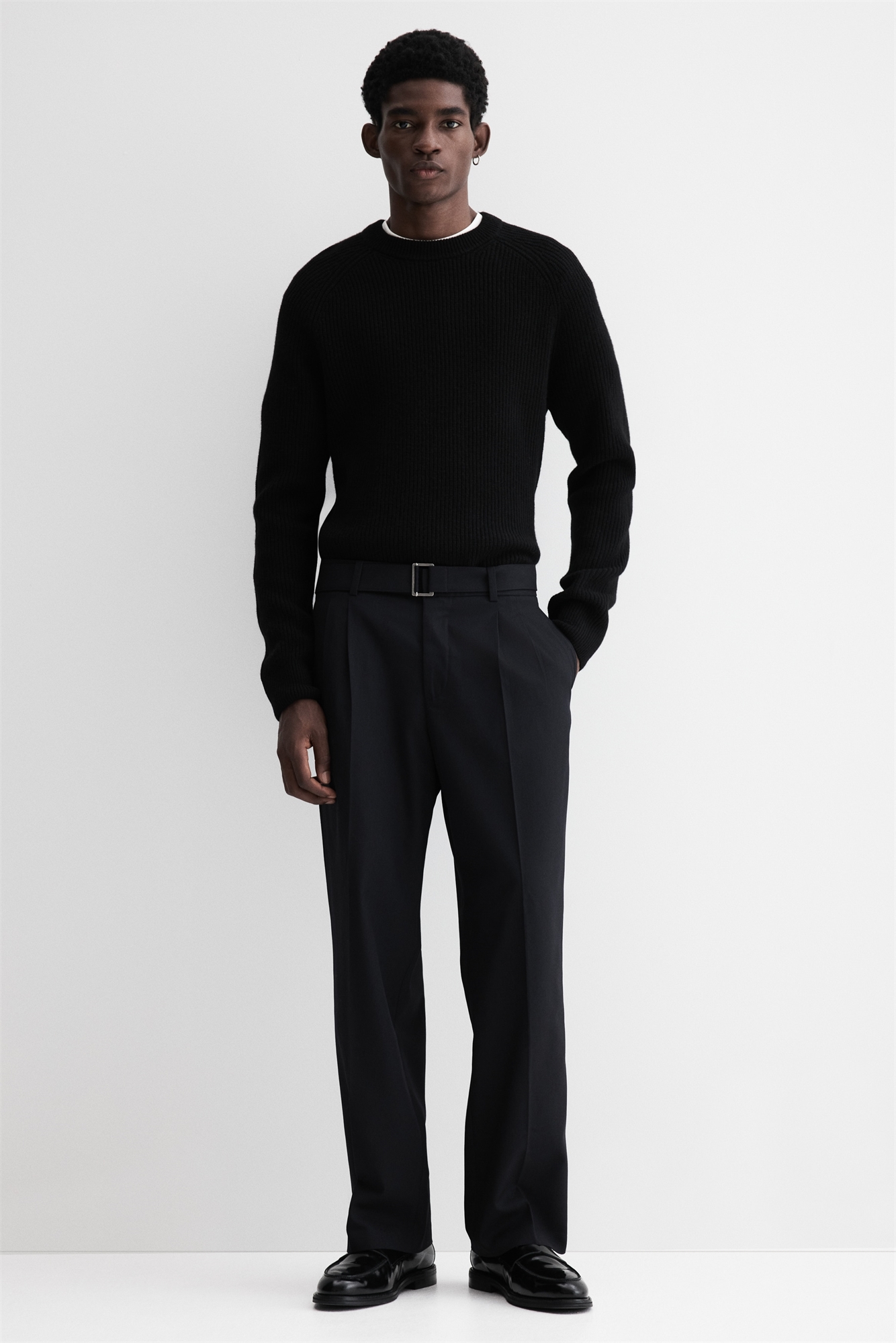 Приталенные брюки мягкого плетения со складками в верхней части, поясом со скрытой застежкой на крючок и глазок, ширинкой на молнии и пуговице и съемным поясом с металлической пряжкой. Диагональные боковые карманы и втачные задние карманы. Расслабленный крой для непринужденного, но не чрезмерного силуэта.