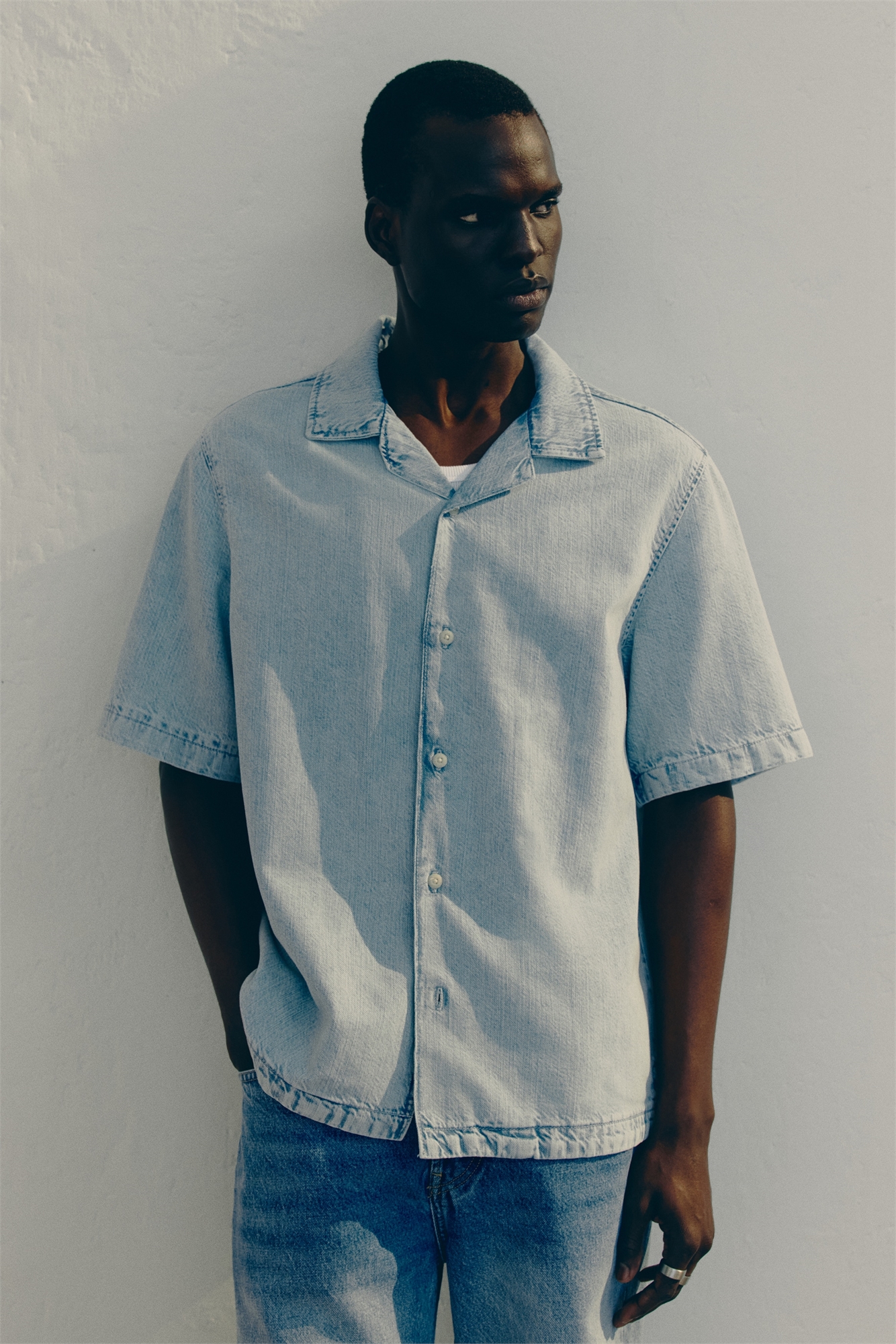 Рубашка с короткими рукавами из мягкого денима, выполненная из смеси лиоцелла и хлопка, с курортным воротником, французским передом, передом и прямым покроем. Регулярный крой для комфортной носки и классического силуэта.