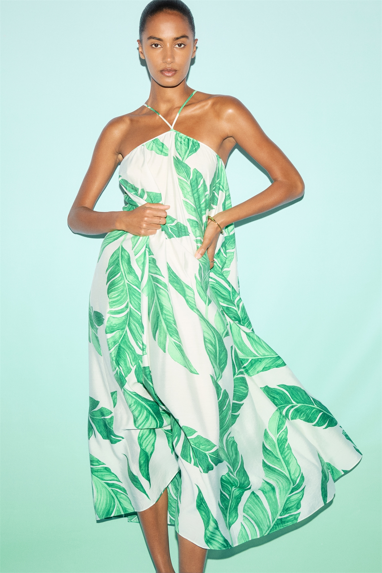 Платье длиной до щиколотки из тканого материала с расклешенным силуэтом. Узкий разрез в верхней части и регулируемые бретели-спагетти. Без подкладки.