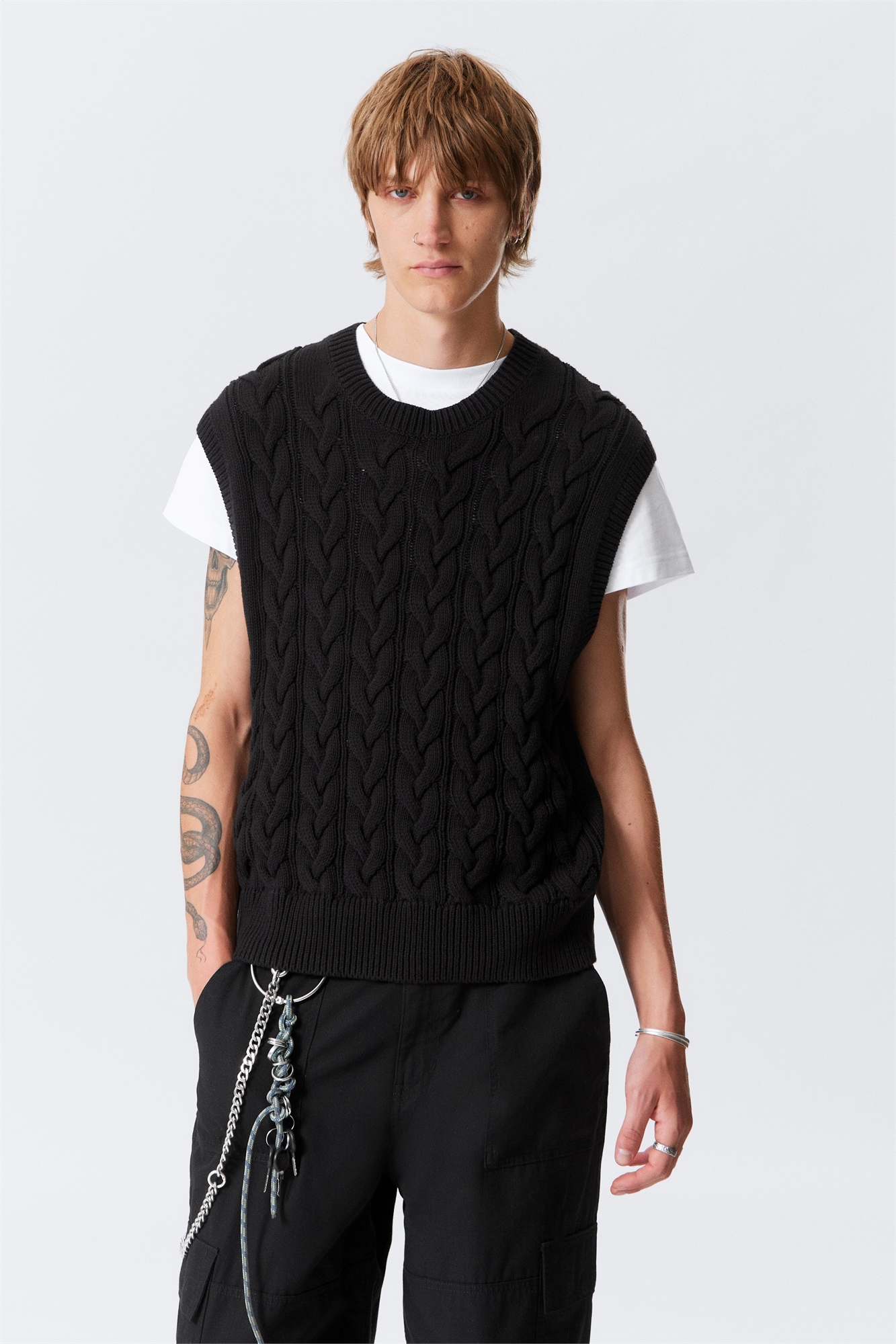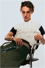 Классический вязаный жилет из мягкой хлопковой пряжи. Модель имеет обычный крой, вырез горловины, ребристую отделку и безрукавку. Вневременная вещь, которая добавит тонкую текстуру в любой образ.
