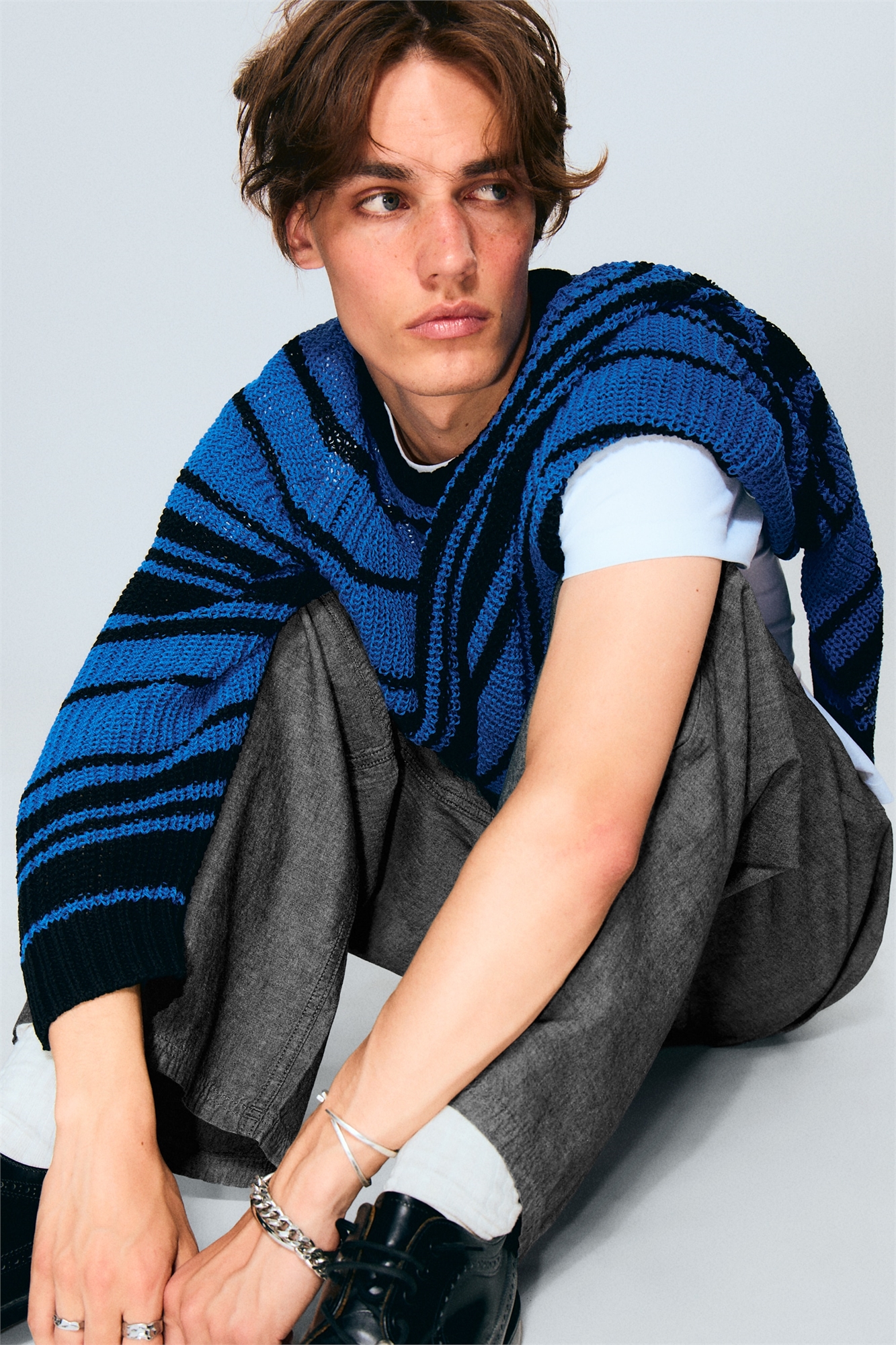 Полосатый свитер с кремовым вырезом и непринужденной посадкой. Вязаный из мягкой пряжи, он имеет рукава реглан и широкий ребристый вырез. Свитер украшен чередующимися широкими и узкими полосками, а манжеты и подол отделаны двухслойной ребристой тесьмой.