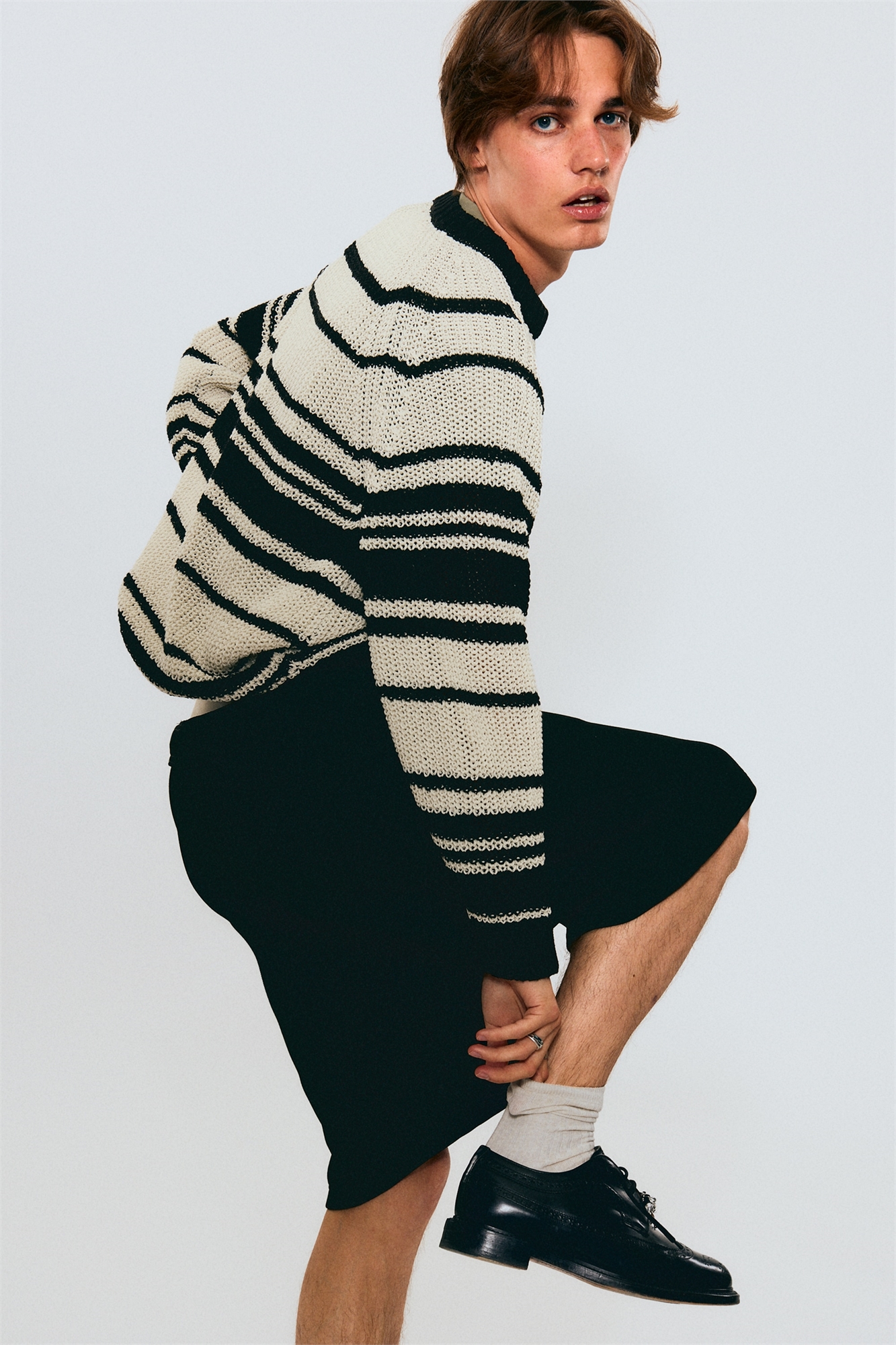 Полосатый свитер с кремовым вырезом и непринужденной посадкой. Вязаный из мягкой пряжи, он имеет рукава реглан и широкий ребристый вырез. Свитер украшен чередующимися широкими и узкими полосками, а манжеты и подол отделаны двухслойной ребристой тесьмой.