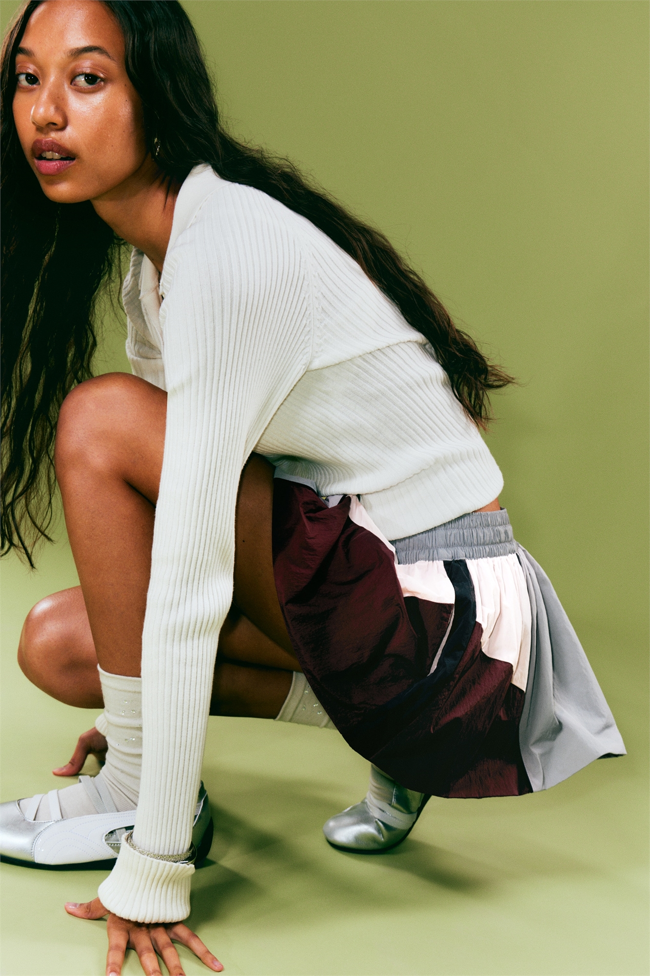 Короткая юбка А-линии с дизайном в стиле колорблок и спортивными мотивами. Юбка изготовлена из переработанного нейлона с ворсистой текстурой и имеет заниженную эластичную талию с плоским шнурком. Боковые швы и боковые панели придают динамику фигуре, а карманы в боковых швах - функциональность. Подкладка из мягкой сетки обеспечивает комфорт и подвижность.
