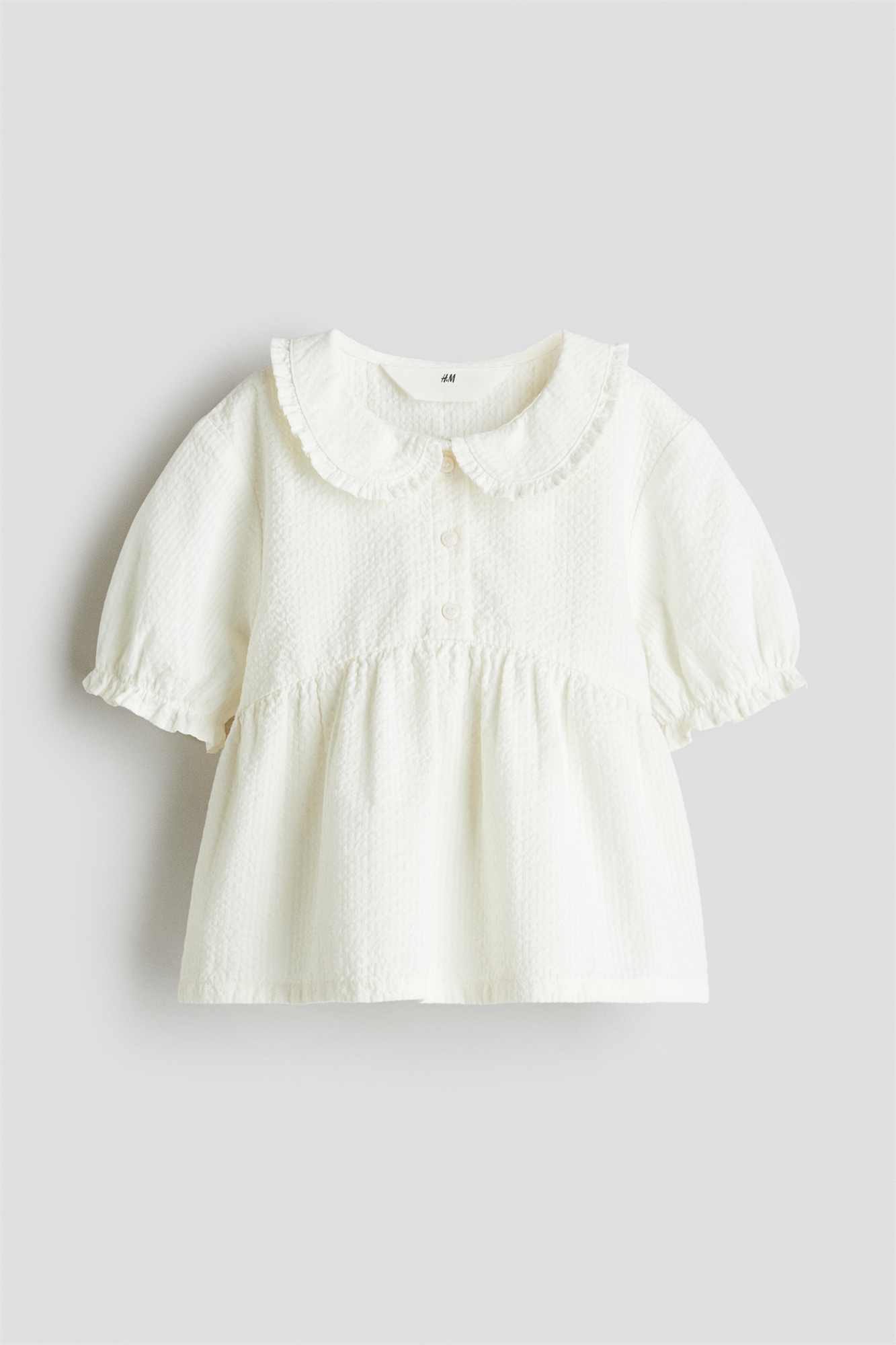 Блузка из мягкой ткани с жатым воротником, пуговицами в верхней части и короткими рукавами с эластичными манжетами. Присборенный шов на талии и широкая пеплум.
