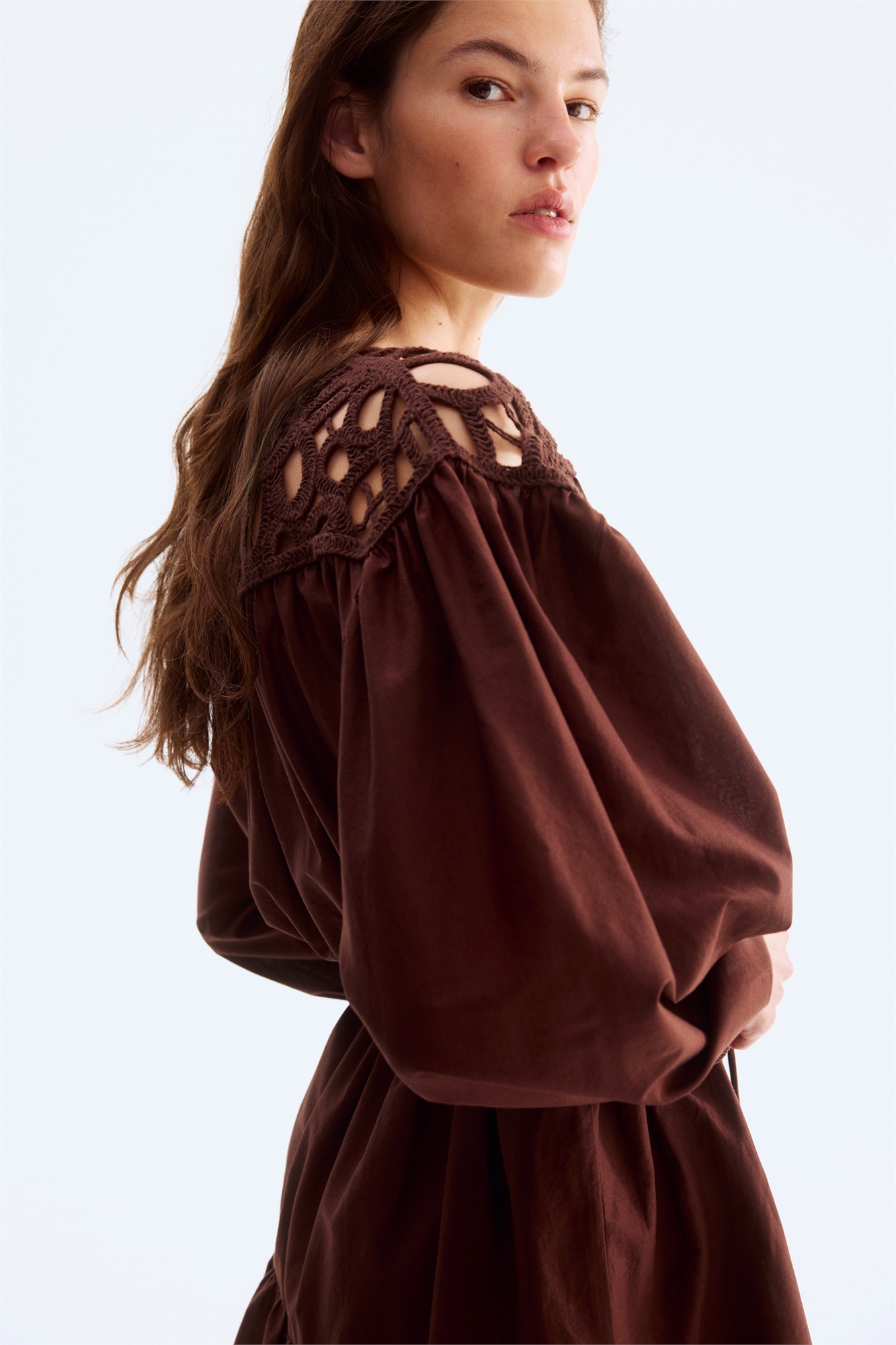 Короткое платье свободного покроя из хлопкового полотна с декоративным узором в виде крючка. Круглый вырез, пройма спереди и длинные рукава-баллон с узкими эластичными манжетами. Завязывающийся на талии пояс с кисточками и сборчатый шов над подолом для придания объема. Без подкладки.