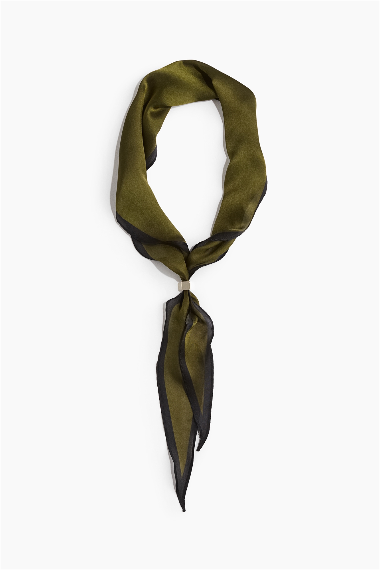 Шейный платок в форме ромба из тканого материала с металлической деталью для укладки.