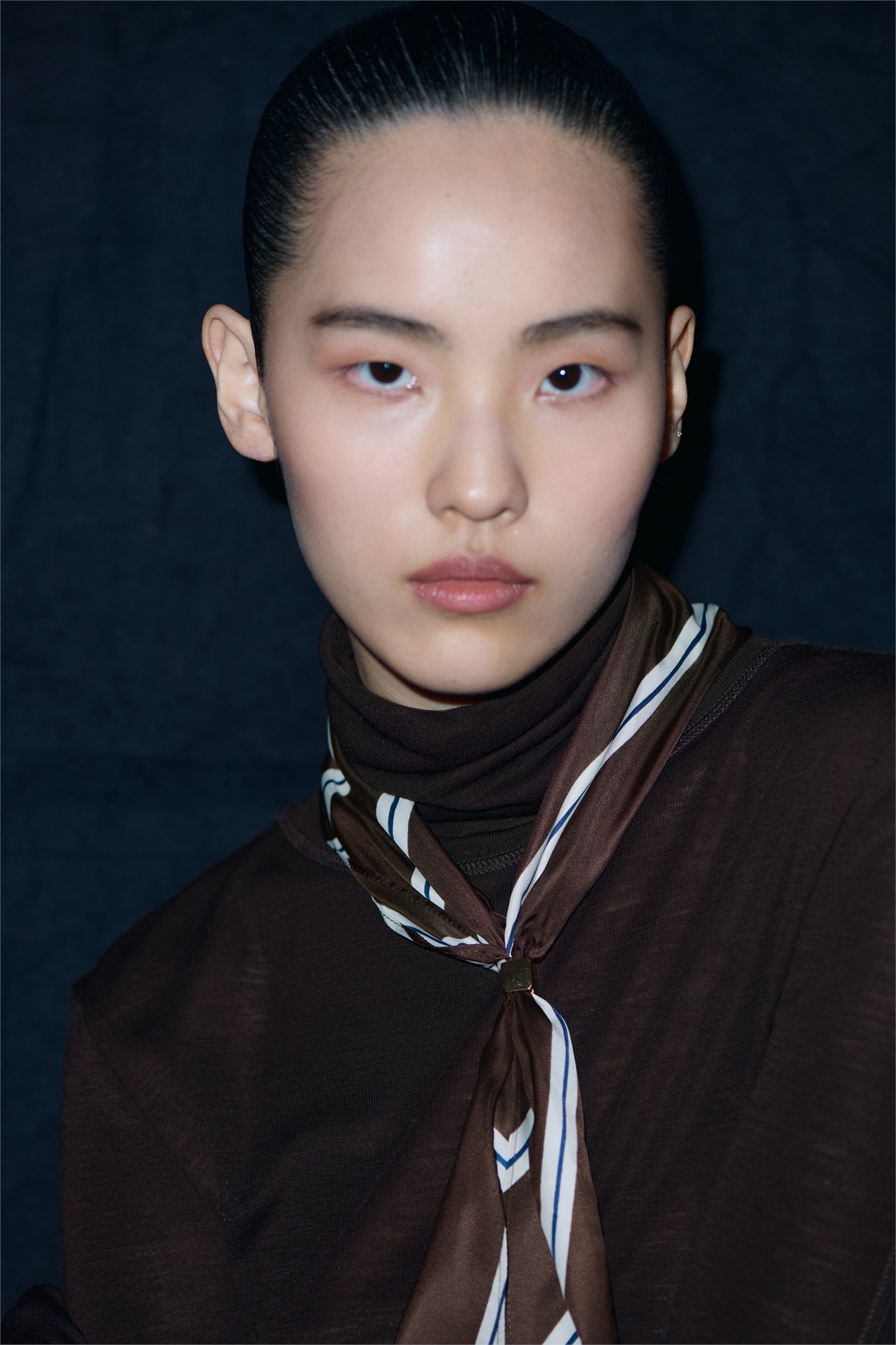 Шейный платок в форме ромба из тканого материала с металлической деталью для укладки.