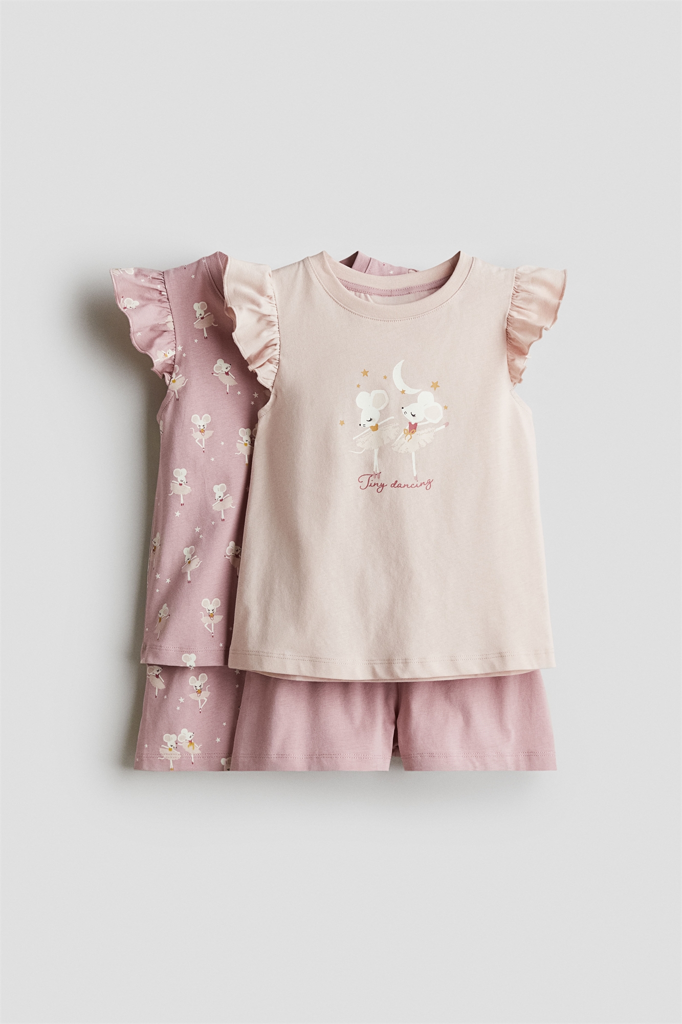 Пижама из мягкого хлопкового джерси. Верхняя часть с круглым вырезом с ребристой отделкой и рукавами-воланами. Шорты с эластичной талией.