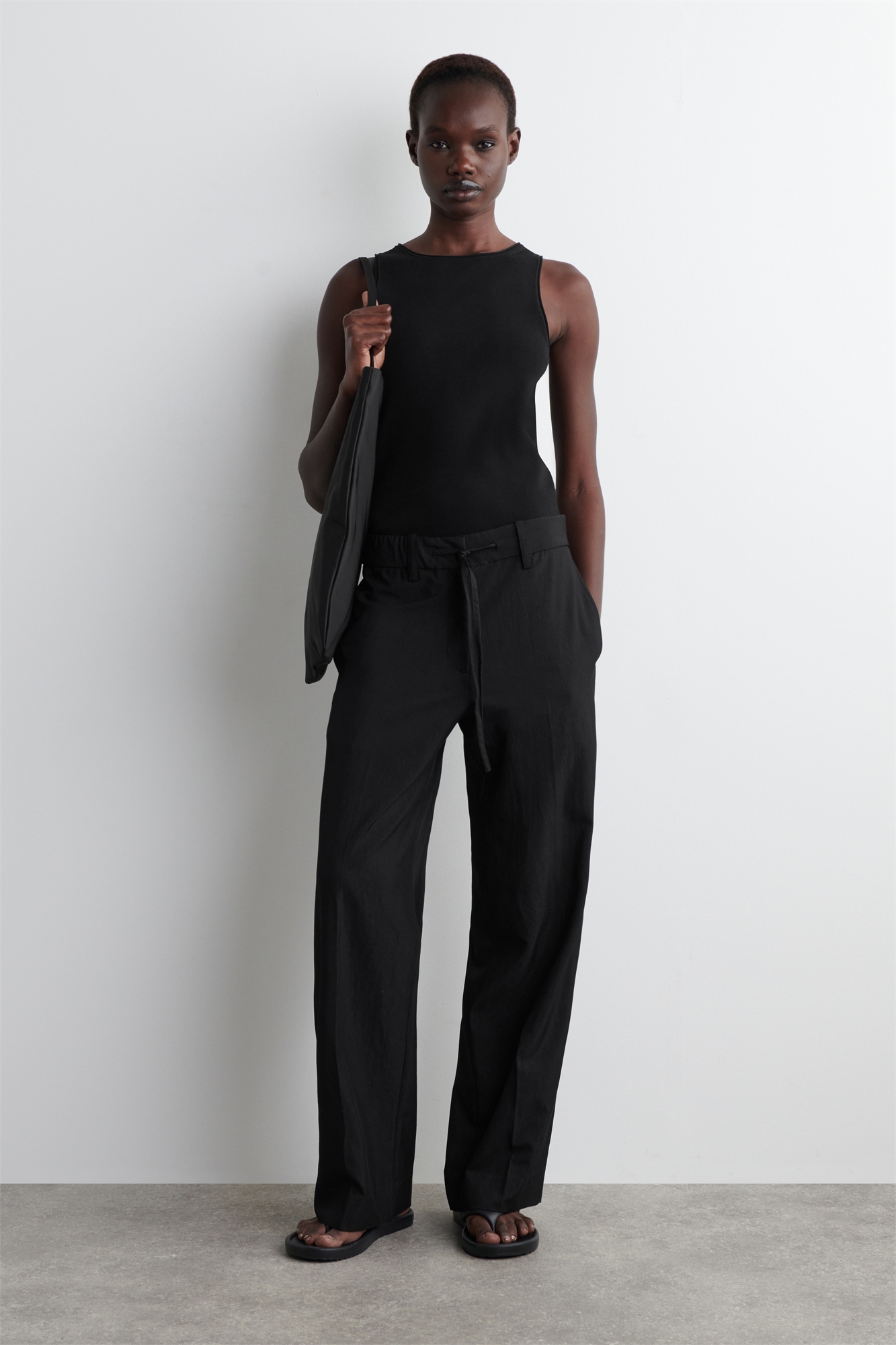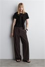 Эти брюки с прямыми ногами, созданные из легкой и эластичной ткани, украшены завязками на талии. Они выполнены в шоколадном цвете, который легко сочетается с остальным вашим гардеробом. Regular fitКрючок, планка и застежка-молнияLENZING™ ECOVERO™ viscose - фирменное вискозное волокно, изготовленное из древесной массы Shell: 65% ECOVERO™ Viscose, 35% Recycled polyamide (Recycled nylon). Подкладка карманов: 100% хлопок. Без учета отделки / Машинная стирка Внутренняя длина штанины размера EU 36 составляет 77,8 см / Модель носит размер EU 36
