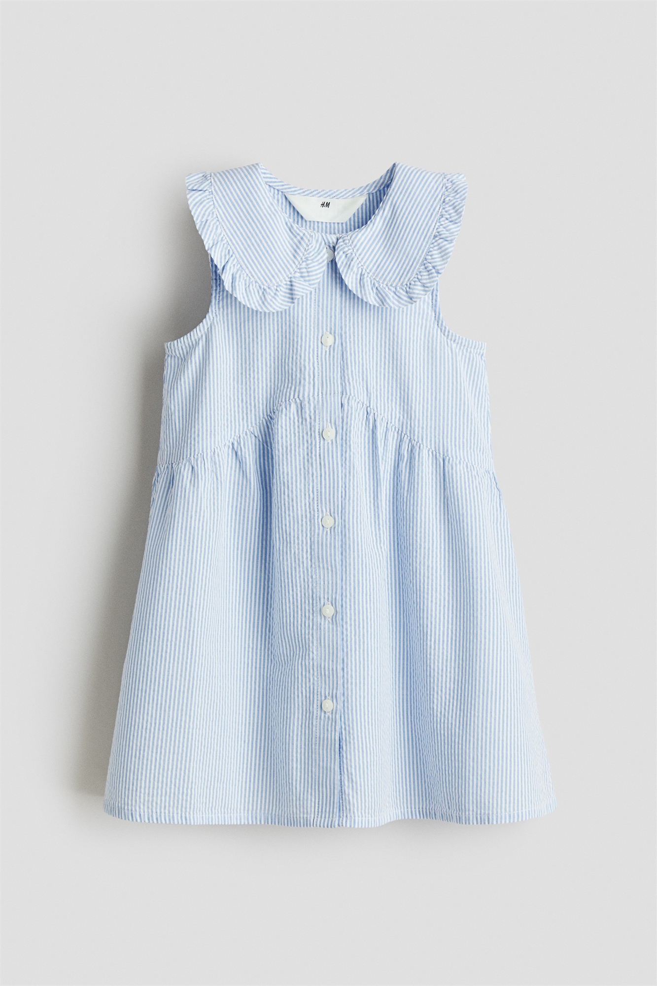Платье А-линии без рукавов из воздушного хлопкового ситцевого полотна. Отложной воротник с воланами, застежка на пуговицах спереди и фигурный шов со сборкой по центру.